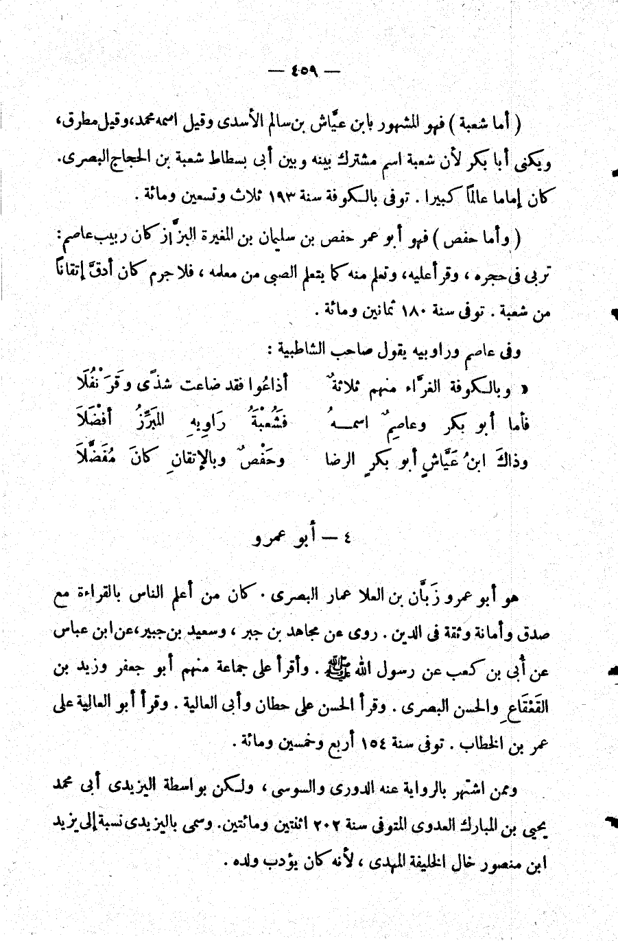 أما شعبة فهو المشهور بابن عياش بن سالم الأسدي وقيل اسمه محمد وقيل مطرق ويكنى أبا بكر لأن شعبة اسم مشترك بينه وبين أبي بسطاط شعبة بن الحجاج البصري. كان إماما عالما كبيرا. توفي بالكوفة سنة 193 ثلاث وتسعين ومائة.