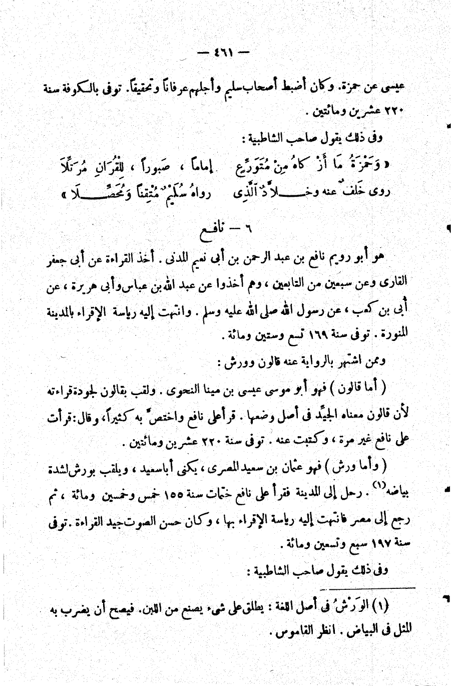 وأما ورش فهو عثمان بن سعيد المصري يكنى أبا سعيد ويلقب بورش لشدة بياضه1. رحل إلى المدينة فقرأ على نافع ختمات سنة 155 خمس وخمسين ومائة ثم رجع إلى مصر فانتهت إليه رياسة الإقراء بها وكان حسن الصوت جيد القراءة. توفي سنة سبع وتسعين ومائة.