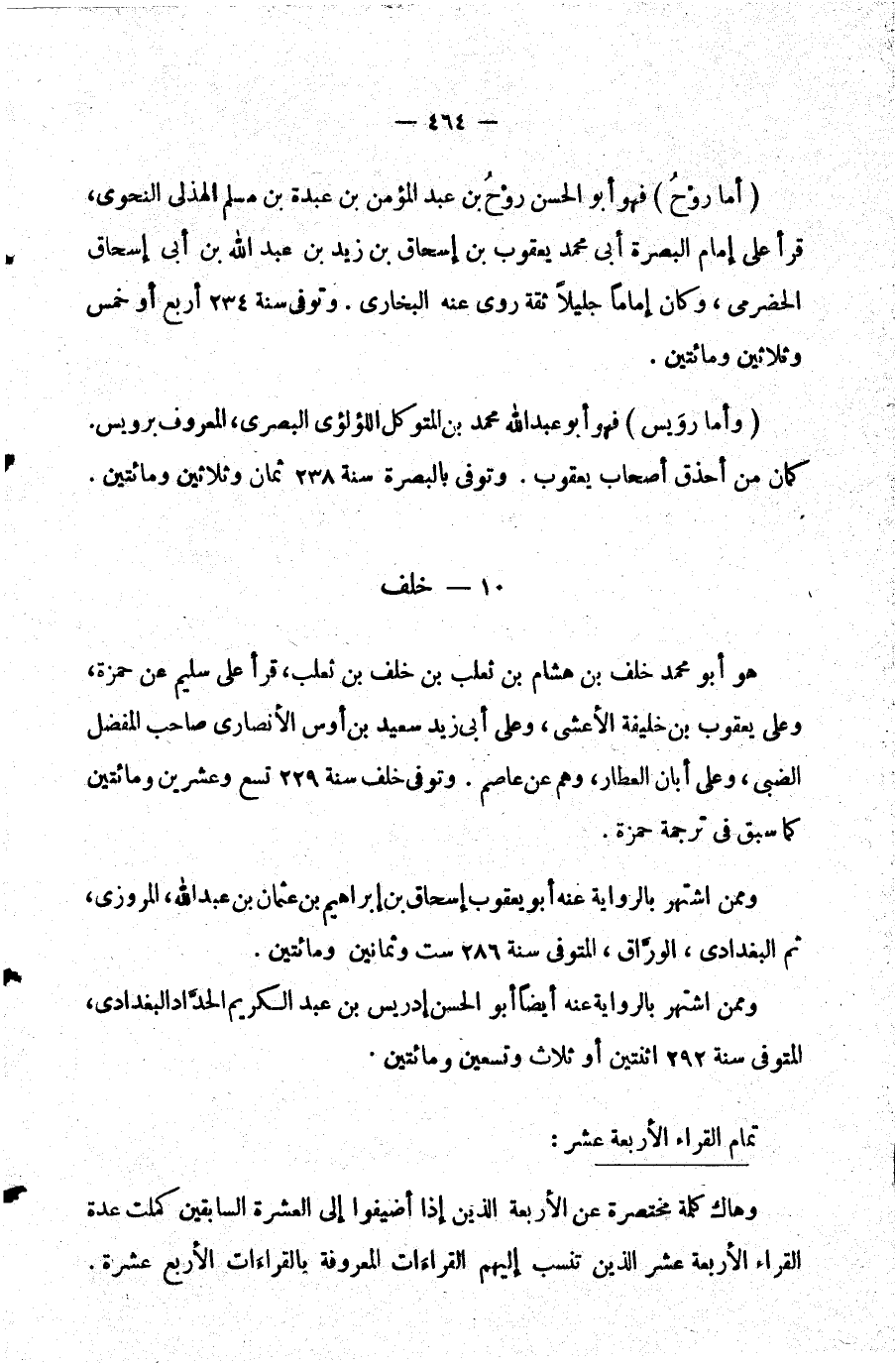 وهاك كلمة مختصرة عن الأربعة الذين إذا أضيفوا إلى العشرة السابقين كملت عدة القراء الأربعة عشر الذين تنسب إليهم القراءات المعروفة بالقراءات الأربع عشرة.