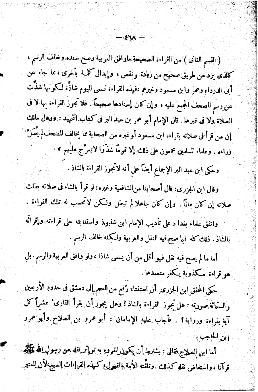حكى المحقق ابن الجزري ان استفتاء رفع من العجم إلى دمشق في حدود الأربعين والستمائة صورته: هل تجوز القراءة بالشاذ؟ وهل يجوز أن يقرأ القارئ عشرا كل آية بقراءة ورواية؟. فأجاب عليه الإمامان: أبو عمرو بن الصلاح وأبو عمرو بن الحاجب.