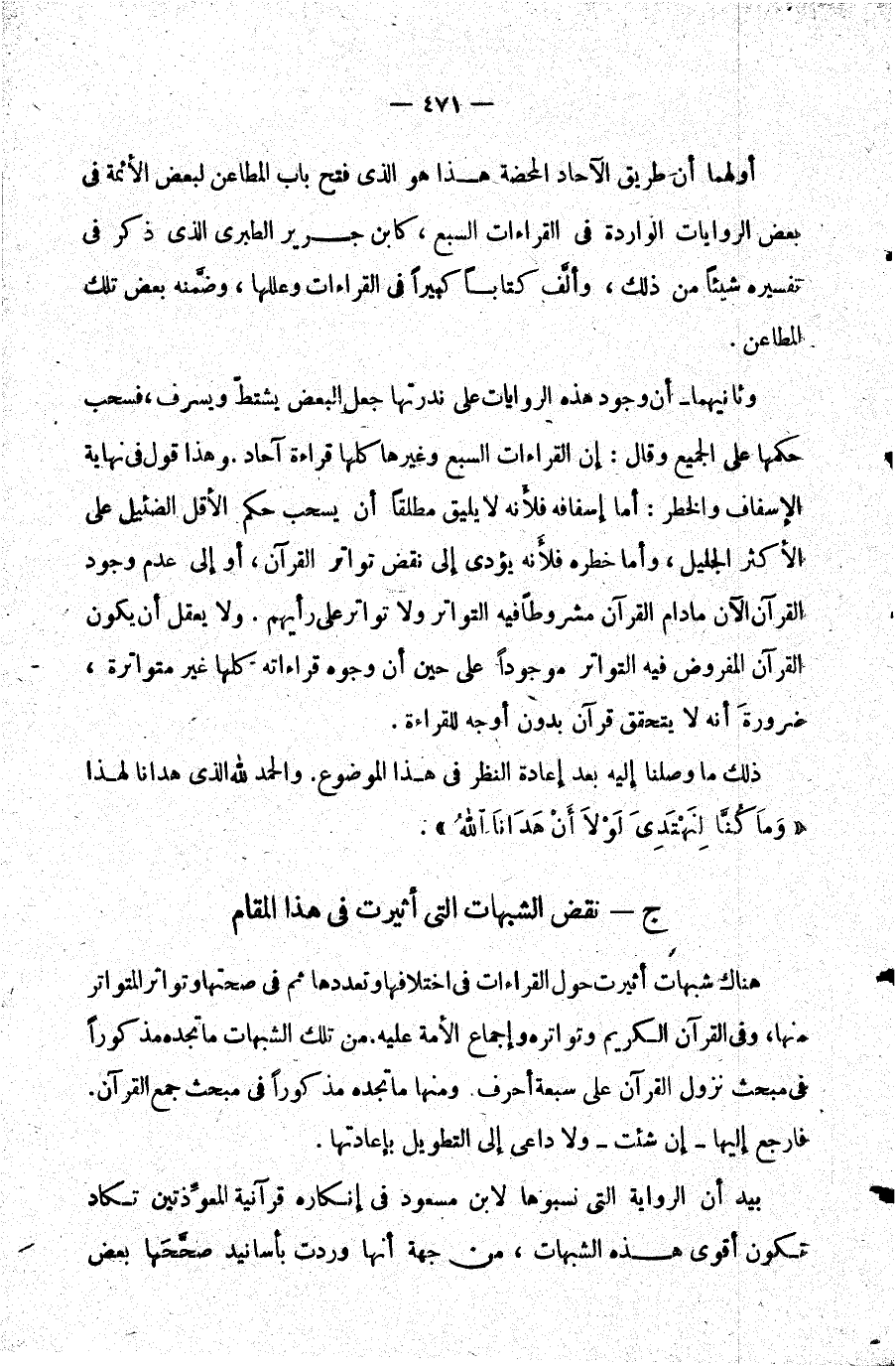 وثانيهما - أن وجود هذه الروايات على ندرتها جعل البعض يشتط ويسرف فسحب حكمها على الجميع وقال: إن القراءات السبع وغيرها كلها قراءة آحاد. وهذا قول في نهاية الإسفاف والخطر أما إسفافه فلأنه لا يليق مطلقا أن يسحب حكم الأقل الضئيل على الأكثر الجليل وأما خطره فلأنه يؤدي إلى نقض تواتر القرآن أو إلى عدم وجود القرآن الآن ما دام القرآن مشروطا فيه التواتر ولا تواتر على رأيهم. ولا يعقل أن يكون القرآن المفروض فيه التواتر موجودا على حين أن وجوه قراءاته كلها غير متواترة ضرورة أنه لا يتحقق قرآن بدون أوجه للقراءة.