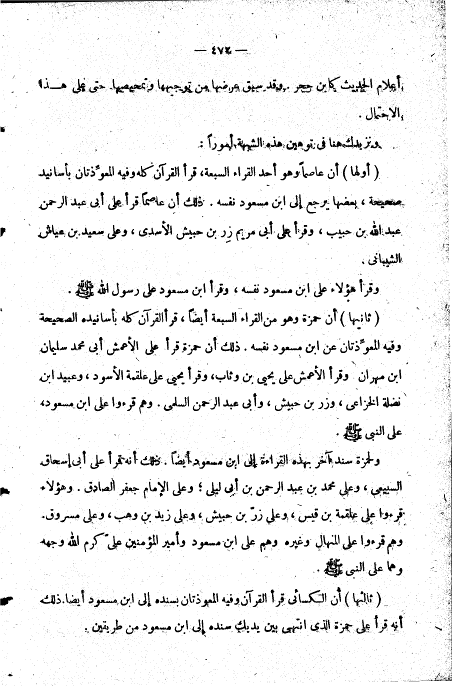 ثالثها: أن الكسائي قرأ القرآن وفيه المعوذتان بسنده إلى ابن مسعود أيضا. ذلك أنه قرأ على حمزة الذي انتهى بين يديك سنده إلى ابن مسعود من طريقين.
