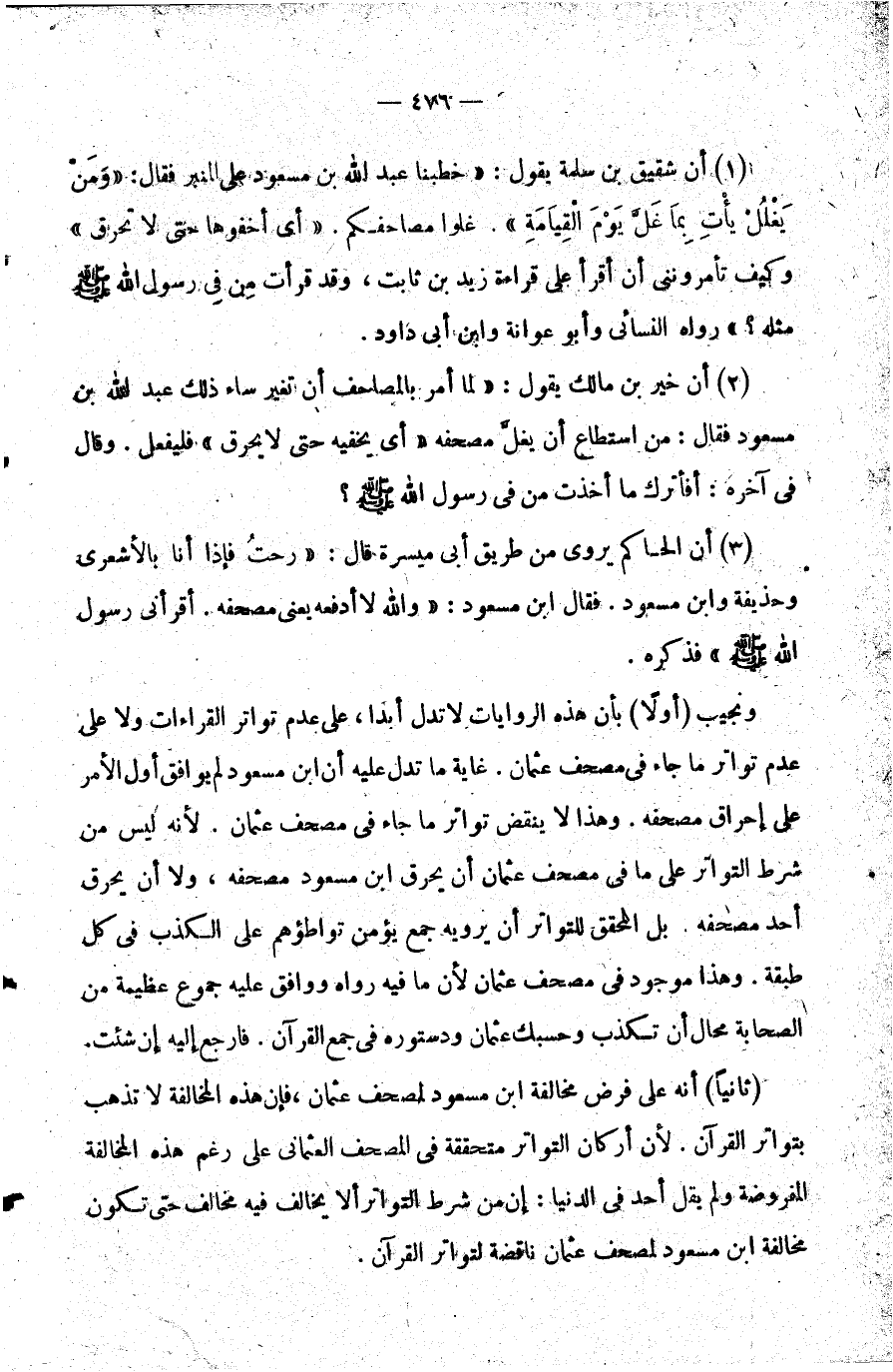 ونجيب: أولا: بأن هذه الروايات لا تدل أبدا على عدم تواتر القراءات ولا على عدم تواتر ما جاء في مصحف عثمان. غاية ما تدل عليه أن ابن مسعود لم يوافق أول الأمر على إحراق مصحفه. وهذا لا ينقض تواتر ما جاء في مصحف عثمان. لأنه ليس من شرط التواتر على ما في مصحف عثمان أن يحرق ابن مسعود مصحفه ولا أن يحرق أحد مصحفه. بل المحقق للتواتر أن يرويه جمع يؤمن تواطؤهم على الكذب في كل طبقة. وهذا موجود في مصحف عثمان لأن ما فيه رواه ووافق عليه جموع عظيمة من الصحابة محال أن تكذب وحسبك عثمان ودستوره في جمع القرآن. فارجع إليه إن شئت.