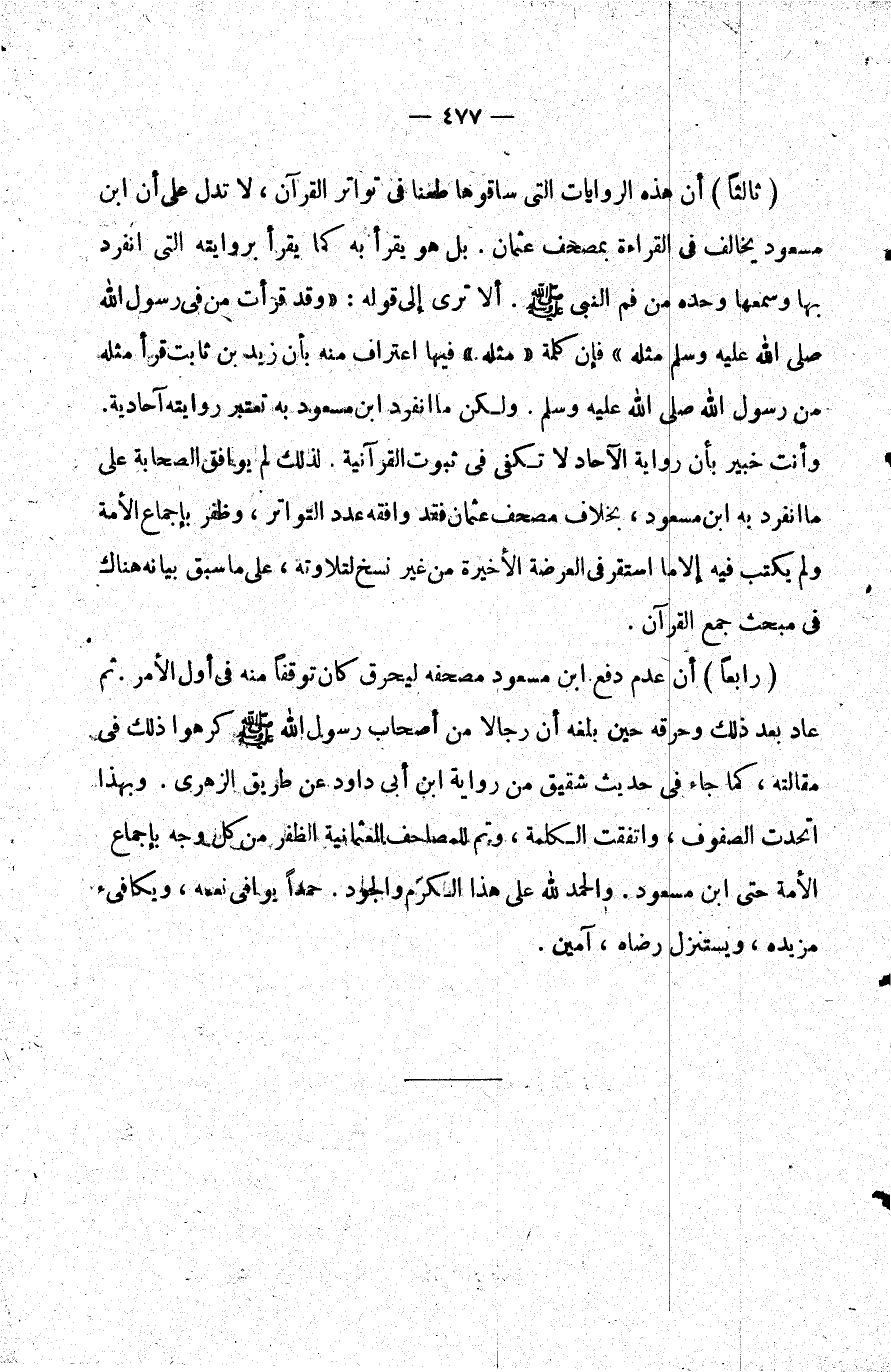 رابعا: أن عدم دفع ابن مسعود مصحفه ليحرق كان توقفا منه في أول الأمر. ثم عاد بعد ذلك وحرقه حين بلغه أن رجالا من أصحاب رسول الله صلى الله عليه وسلم كرهوا ذلك في مقالته كما جاء في حديث شقيق من رواية ابن أبي داود عن طريق الزهري. وبهذا اتحدت الصفوف واتفقت الكلمة وتم للمصاحف العثمانية الظفر من كل وجه بإجماع الأمة حتى ابن مسعود. والحمد لله على هذا الكرم والجود. حمدا يوافي نعمه ويكافئ مزيده ويستنزل رضاه آمين.