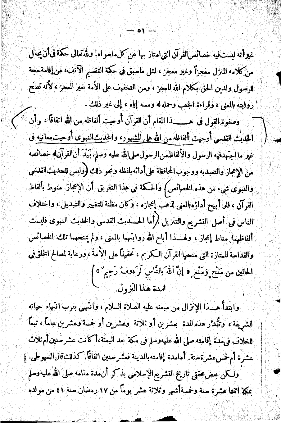 وصفوة القول في هذا المقام أن القرآن أوحيت ألفاظه من الله اتفاقا وأن الحديث القدسي أوحيت ألفاظه من الله على المشهور والحديث النبوي أوحيت معانيه في غير ما اجتهد فيه الرسول والألفاظ من الرسول صلى الله عليه وسلم. بيد أن القرآن له خصائصه من الإعجاز والتعبد به ووجوب المحافظة على أدائه بلفظه ونحو ذلك وليس للحديث القدسي والنبوي شيء من هذه الخصائص. والحكمة في هذا التفريق أن الإعجاز منوط بألفاظ القرآن فلو أبيح أداؤه بالمعنى لذهب إعجازه وكان مظنة للتغيير والتبديل واختلاف الناس في أصل التشريع والتنزيل. أما الحديث القدسي والحديث النبوي فليست ألفاظهما مناط إعجاز ولهذا أباح الله روايتهما بالمعنى ولم يمنحهما تلك الخصائص والقداسة الممتازة التي منحها القرآن الكريم تخفيفا على الأمة ورعاية لمصالح الخلق في الحالين من منح ومنع {إِنَّ اللَّهَ بِالنَّاسِ لَرَؤُوفٌ رَحِيمٌ} .