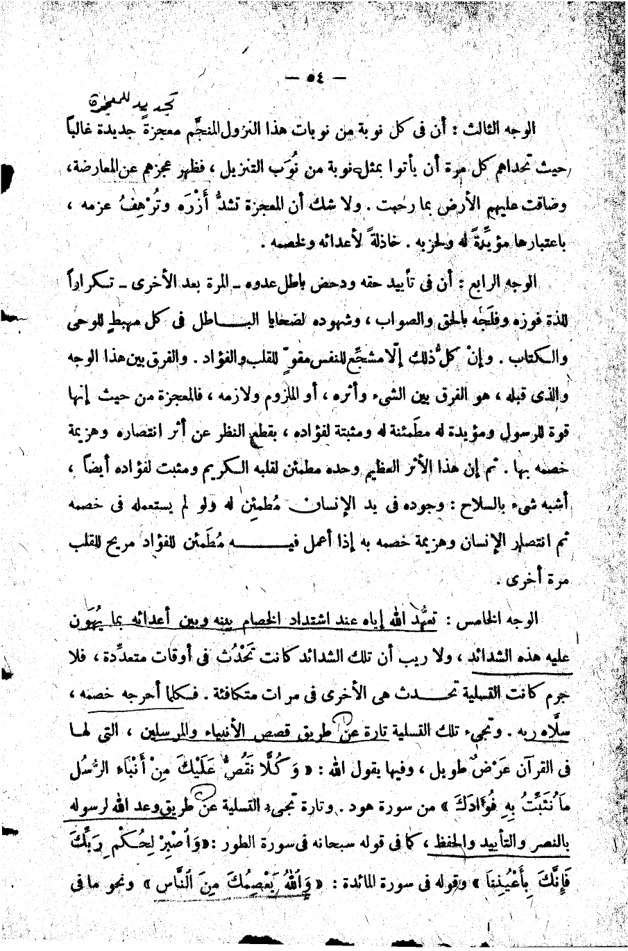 الوجه الرابع: أن في تأييد حقه ودحض باطل عدوه المرة بعد الأخرى تكرارا للذة فوزه وفلجه بالحق والصواب وشهوده لضحايا الباطل في كل مهبط للوحي والكتاب. وإن كل ذلك إلا مشجع للنفس مقو للقلب والفؤاد والفرق بين هذا الوجه والذي قبله هو الفرق بين الشيء وأثره أو الملزوم ولازمه فالمعجزة من حيث إنها قوة للرسول ومؤيدة له مطمئنة له ومثبتة لفؤاده بقطع النظر عن أثر انتصاره وهزيمة خصمه بها