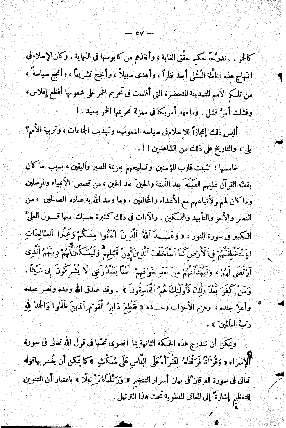 كالخمر تدرجا حكيما حقق الغاية وأنقذهم من كابوسها في النهاية. وكان الإسلام في انتهاج هذه الخطة المثلى أبعد نظرا, وأهدى سبيلا وأنجح تشريعا وأنجع سياسة من تلكم الأمم المتمدنية المتحضرة التي أفلست في تحريم الخمر على شعوبها أفظع إفلاس وفشلت أمر فشل. وما عهد أمريكا في مهزلة تحريمها الخمر ببعيد.