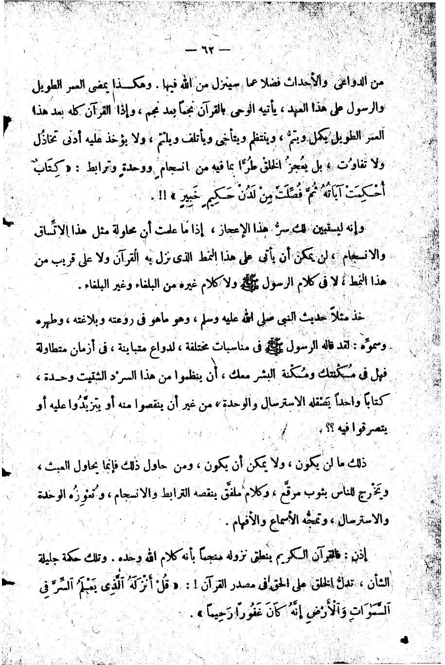 خذ مثلا حديث النبي صلى الله عليه وسلم وهو ما هو في روعته وبلاغته وطهره وسموه لقد قاله الرسول صلى الله عليه وسلم في مناسبات مختلفة لدواع متباينة في أزمان متطاولة فهل في مكنتك ومكنة البشر معك أن ينظموا من هذا السرد الشتيت وحدة كتابا واحدا يصقله الاسترسال والوحدة من غير أن ينقصوا منه أو يتزيدوا عليه أو يتصرفوا فيه؟؟.