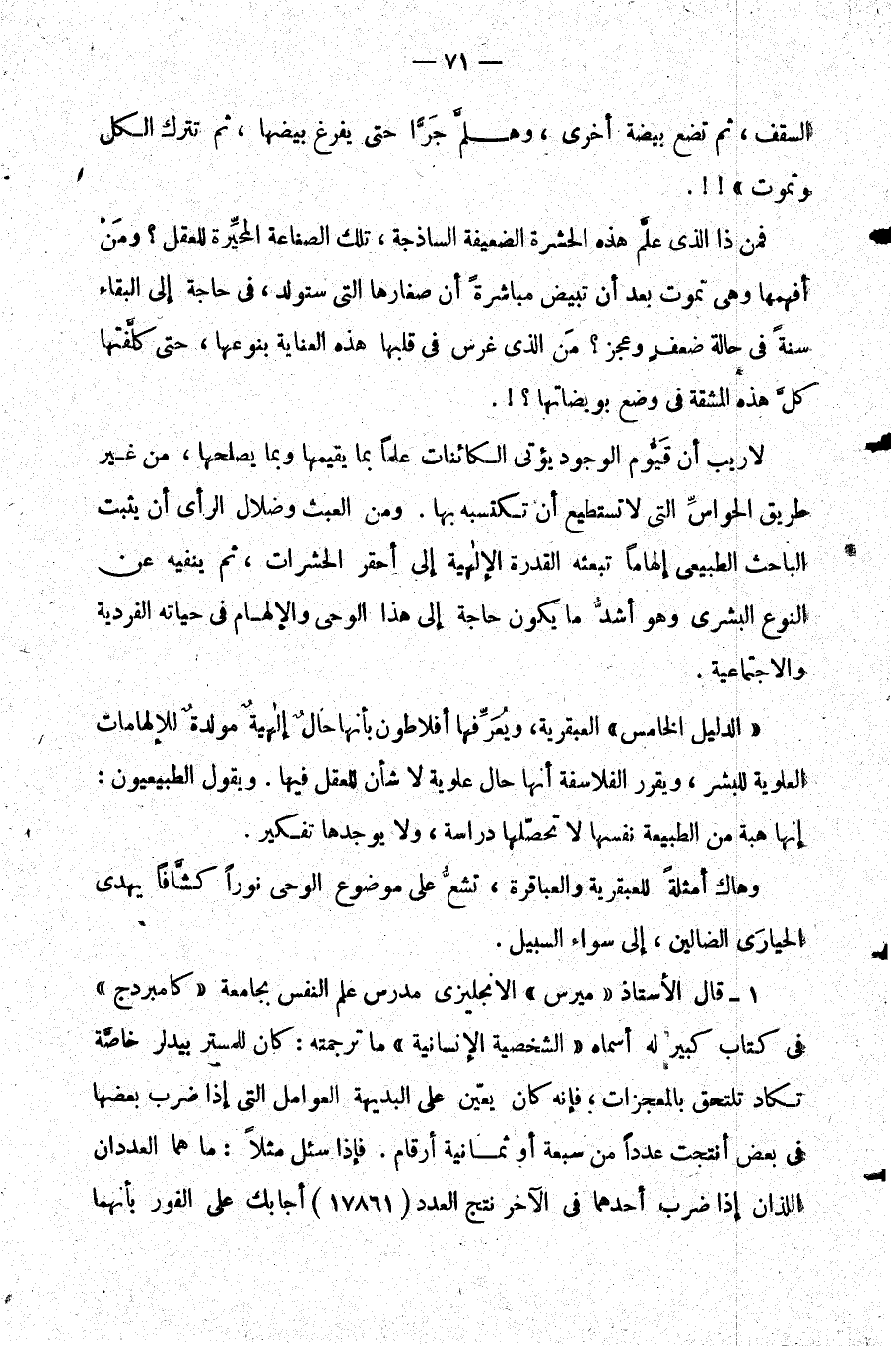 لا ريب أن قيوم الوجود يؤتي الكائنات علما بما يقيمها وبما يصلحها من غير طريق الحواس التي لا تستطيع أن تكتسبه بها. ومن العبث وضلال الرأي أن يثبت الباحث الطبيعي إلهاما تبعثه القدرة الإلهية إلى أحقر الحشرات ثم ينفيه عن النوع البشري وهو أشد ما يكون حاجة إلى هذا الوحي والإلهام في حياته الفردية والاجتماعية.