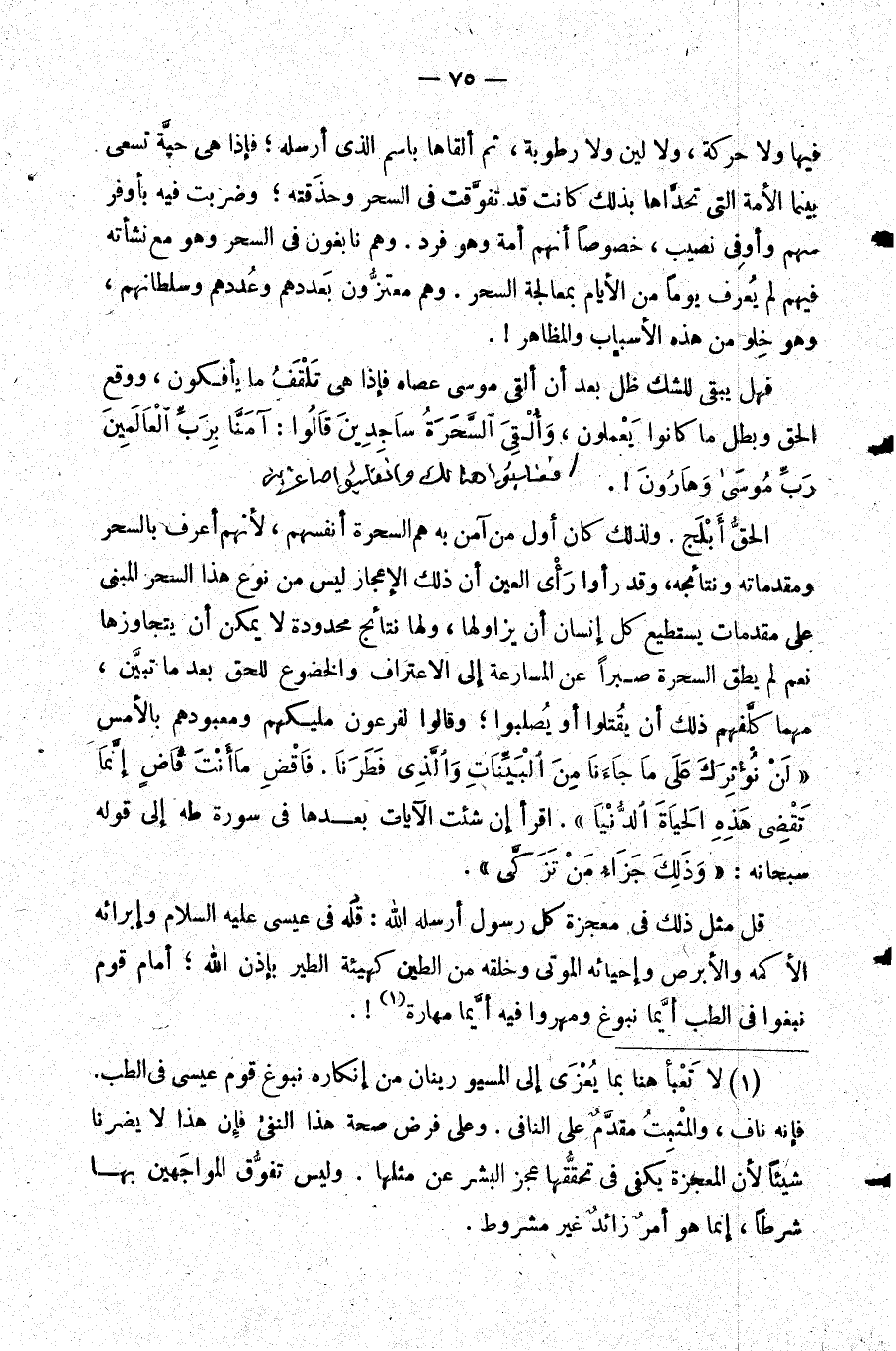 1 لا تعبأ هنا بما يعزى إلى المسيو رينان من إنكاره نبوغ قوم عيسى في الطب. فإنه ناف, والمثبت مقدم على النافي. وعلى فرض صحة هذا النفي فإن هذا لا يضرنا شيئا لأن المعجزة يكفي في تحققها عجز البشر عن مثلها. وليس تفوق المواجهين بها شرطا، إنما هو أمر زائد غير مشروط.