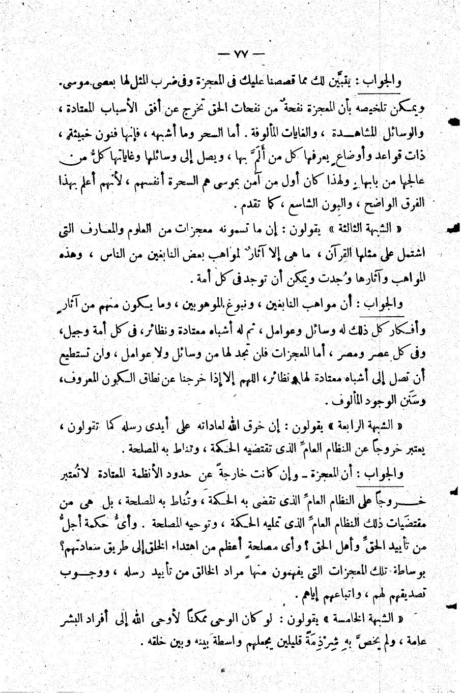 والجواب: أن المعجزة وإن كانت خارجة عن حدود الأنظمة المعتادة لا تعتبر خروجا على النظام العام الذي تقضي به الحكمة وتناط به المصلحة بل هي من مقتضيات ذلك النظام العام الذي تمليه الحكمة وتوحيه المصلحة. وأي حكمة أجل من تأييد الحق وأهل الحق؟ وأي مصلحة أعظم من اهتداء الخلق إلى طريق سعادتهم؟ بوساطة تلك المعجزات التي يفهمون منها مراد الخالق من تأييد رسله ووجوب تصديقهم لهم واتباعهم إياهم.