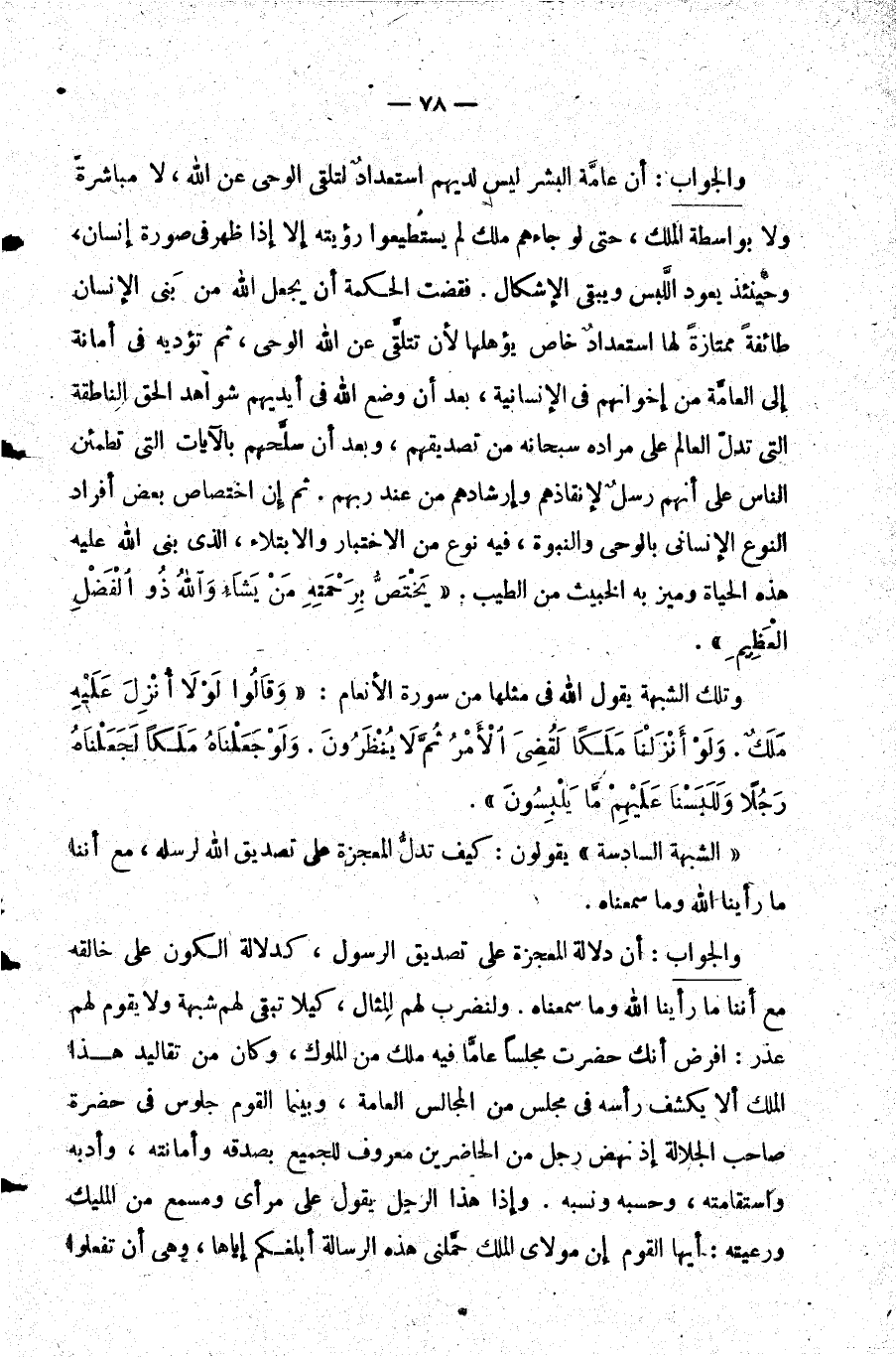 والجواب: أن دلالة المعجزة على تصديق الرسول كدلالة الكون على خالقه مع أننا ما رأينا الله وما سمعناه ولنضرب لهم المثال كيلا تبقى لهم شبهة ولا يقوم لهم عذر افرض أنك حضرت مجلسا عاما فيه ملك من الملوك وكان من تقاليد هذا الملك ألا يكشف رأسه في مجلس من المجالس العامة وبينما القوم جلوس في حضرة صاحب الجلالة إذ نهض رجل من الحاضرين معروف للجميع بصدقه وأمانته وأدبه واستقامته وحسبه ونسبه. وإذا هذا الرجل يقول على مرأى ومسمع من المليك ورعيته: أيها القوم إن مولاي الملك حملني هذه الرسالة أبلغكم إياها وهي أن تفعلوا