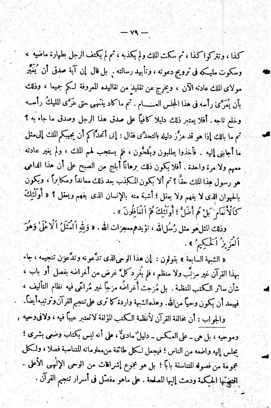 الشبهة السابعة يقولون: إن هذا الوحي للذي تدعونه وتدعون تنجيمه جاء بهذا القرآن غير مرتب ولا منظم فلم يفرد كل غرض من أغراضه بفصل أو باب شأن سائر الكتب المنظمة. بل مزجت أغراضه مزجا غير مراعى فيه نظام التأليف فيبعد أن يكون وحيا من الله. وهذه الشبهة واردة كما ترى على تنجيم القرآن وترتيبه أيضا.