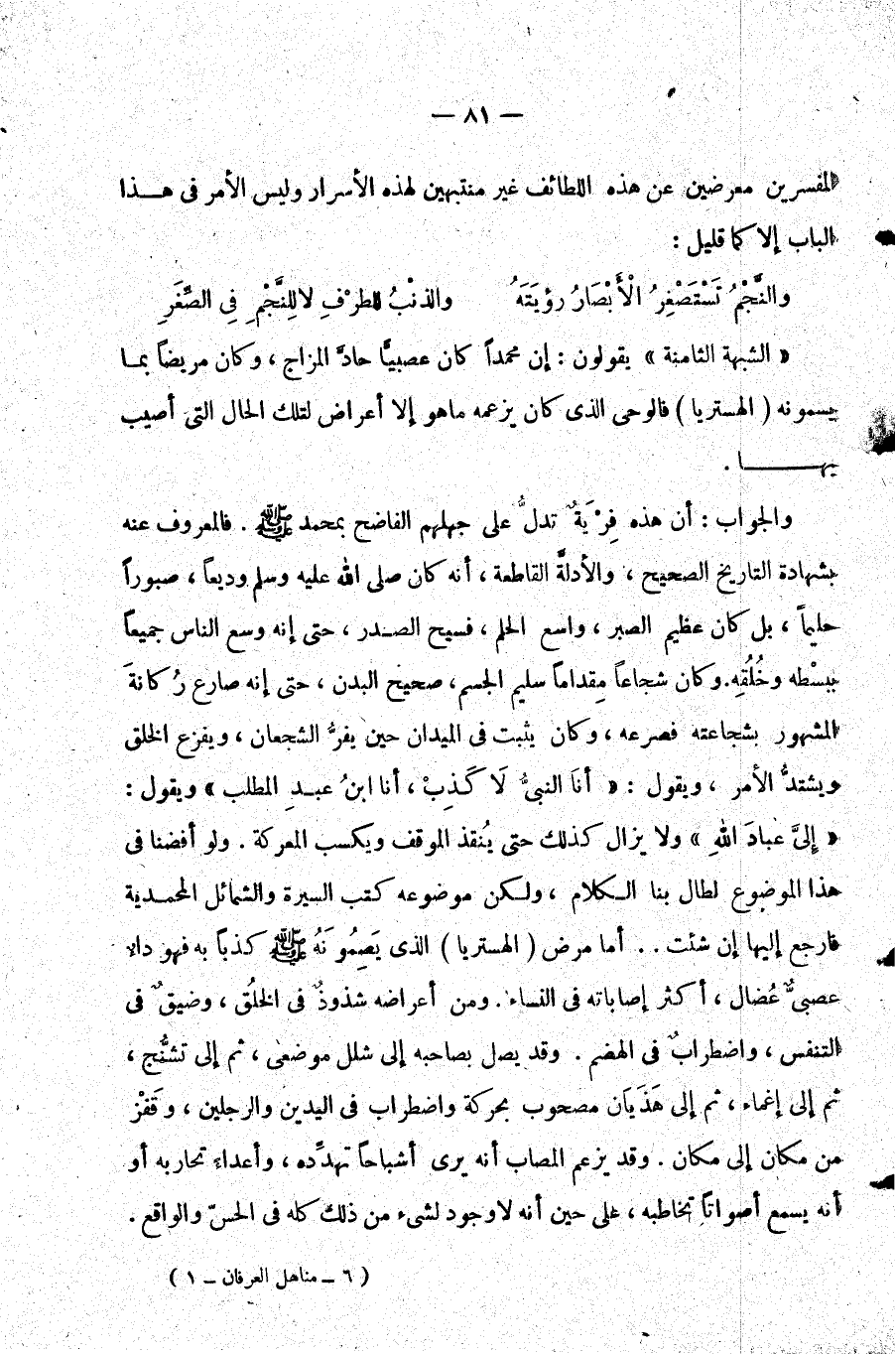 والجواب: أن هذه فرية تدل على جهلهم الفاضح بمحمد صلى الله عليه وسلم. فالمعروف عنه بشهادة التاريخ الصحيح والأدلة القاطعة أنه كان وديعا صبورا حليما بل كان عظيم الصبر واسع الحلم فسيح الصدر حتى إنه وسع الناس جميعا ببسطه وخلقه. وكان شجاعا مقداما سليم الجسم صحيح البدن، حتى إنه صارع ركانة المشهور بشجاعته فصرعه وكان يثبت في الميدان حين يفر الشجعان ويفزع الخلق ويشتد الأمر ويقول: "أنا النبي لا كذب أنا ابن عبد المطلب" ويقول: "إلي عباد الله" ولا يزال كذلك حتى ينقذ الموقف ويكسب المعركة. ولو أفضنا في هذا الموضوع لطال بنا الكلام ولكن موضوعه كتب السيرة والشمائل المحمدية فارجع إليها إن شئت أما مرض الهستريا الذي يصمونه كذبا به فهو داء عصبي عضال أكثر إصاباته في النساء. ومن أعراضه شذوذ في الخلق وضيق في التنفس واضطراب في الهضم. وقد يصل بصاحبه إلى شلل موضعي ثم إلى تشنج ثم إلى إغماء ثم إلى هذيان مصحوب بحركة واضطراب في اليدين والرجلين وقفز من مكان إلى مكان. وقد يزعم المصاب أنه يرى أشباحا تهدده وأعداء تحاربه أو أنه يسمع أصواتا تخاطبه على حين أنه لا وجود لشيء من ذلك كله في الحس والواقع.