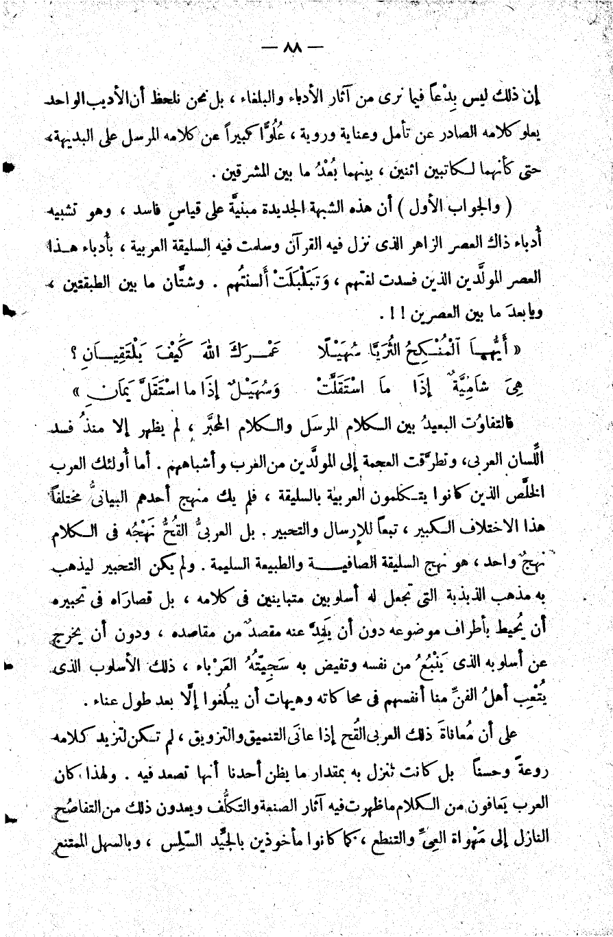 فالتفاوت البعيد بين الكلام المرسل والكلام المحبر لم يظهر إلا منذ فسد اللسان العربي وتطرقت العجمة إلى المولدين من العرب وأشباههم. أما أولئك العرب الخلص الذين كانوا يتكلمون العربية بالسليقة فلم يك منهج أحدهم البياني مختلفا هذا الاختلاف الكبير تبعا للإرسال والتحبير. بل العربي القح نهجه في الكلام نهج واحد هو نهج السليقة الصافية والطبيعة السليمة. ولم يكن التحبير ليذهب به مذهب الذبذبة التي تجعل له أسلوبين متباينين في كلامه بل قصاراه في تحبيره أن يحيط بأطراف موضوعه دون أن يند عنه مقصد من مقاصده ودون أن يخرج عن أسلوبه الذي ينبع من نفسه وتفيض به سجيته العرباء ذلك الأسلوب الذي يتعب أهل الفن منا أنفسهم في محاكاته وهيهات أن يبلغوا إلا بعد طول عناء.