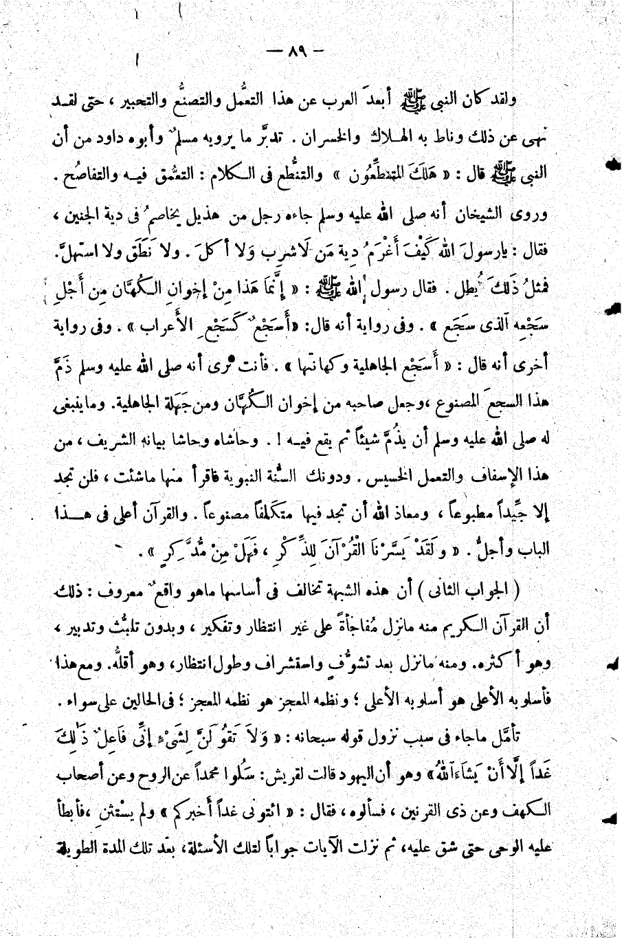 ولقد كان النبي صلى الله عليه وسلم أبعد العرب عن هذا التعمل والتصنع والتحبير حتى لقد نهى عن ذلك وناط به الهلاك والخسران. تدبر ما يرويه مسلم وأبو داود من أن النبي صلى الله عليه وسلم قال: "هلك المتنطعون" والتنطع في الكلام: التعمق فيه والتفاصح. وروى الشيخان أنه جاءه رجل من هذيل يخاصم في دية الجنين فقال: يا رسول الله كيف أغرم دية من لا شرب ولا أكل. ولا نطق ولا استهل. فمثل ذلك يطل. فقال رسول الله صلى الله عليه وسلم: "إنما هذا من إخوان الكهان" من أجل سجعه الذي سجع. وفي رواية أنه قال: "أسجع كسجع الأعراب". وفي رواية أخرى أنه قال: "أسجع الجاهلية وكهانتها". فأنت ترى أنه ذم هذا السجع المصنوع وجعل صاحبه من إخوان الكهان ومن جهلة الجاهلية. وما ينبغي له أن يذم شيئا ثم يقع فيه. وحاشاه وحاشا بيانه الشريف من هذا الإسفاف والتعمل الخسيس. ودونك السنة النبوية فاقرأ منها ما شئت فلن تجد إلا جيدا مطبوعا ومعاذ الله أن تجد فيها متكلفا مصنوعا. والقرآن أعلى في هذا الباب وأجل. {وَلَقَدْ يَسَّرْنَا الْقُرْآنَ لِلذِّكْرِ فَهَلْ مِنْ مُدَّكِرٍ} .