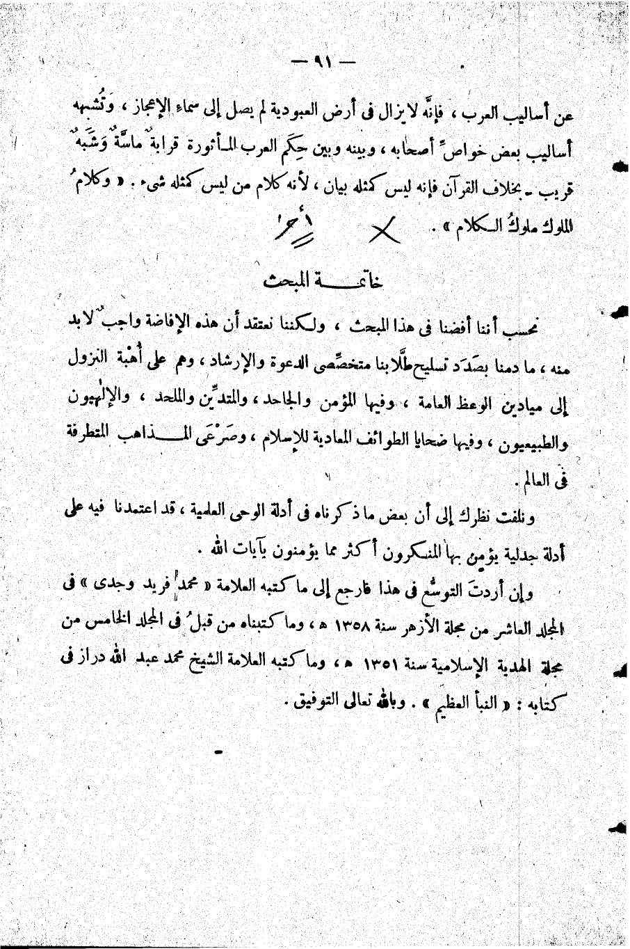 وإن أردت التوسع في هذا فارجع إلى ما كتبه العلامة محمد فريد وجدي في المجلد العاشر من مجلة الأزهر سنة 1358 هـ, وما كتبناه من قبل في المجلد الخامس من مجلة الهدية الإسلامية سنة 1351 هـ, وما كتبه العلامة الشيخ محمد عبد الله دراز في كتابه: النبأ العظيم. وبالله تعالى التوفيق.