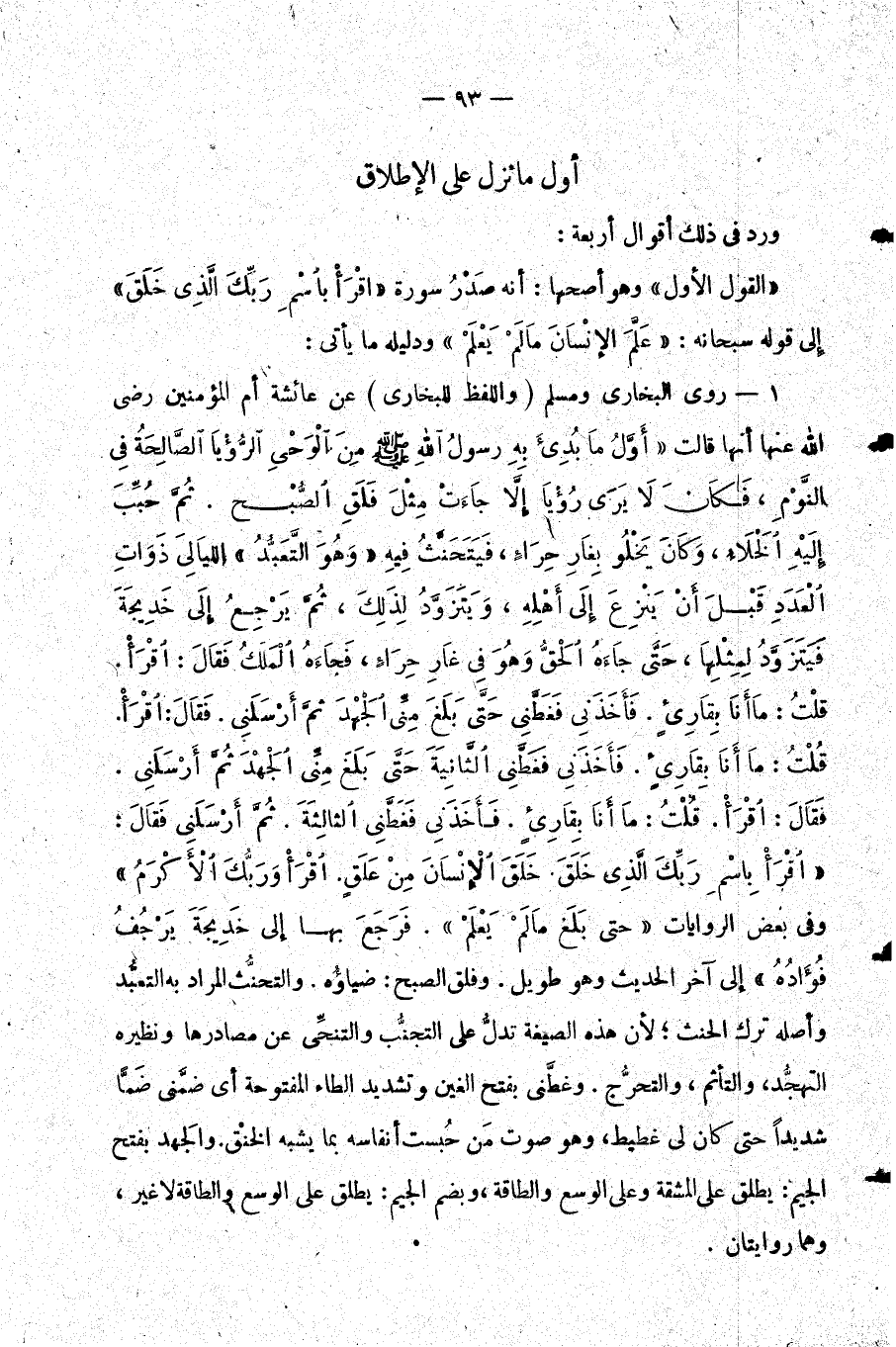 1- روى البخاري ومسلم واللفظ للبخاري عن عائشة أم المؤمنين رضي الله عنها أنها قالت: أول ما بدئ به رسول الله صلى الله عليه وسلم من الوحي الرؤيا الصالحة في النوم فكان لا يرى رؤيا إلا جاءت مثل فلق الصبح. ثم حبب إليه الخلاء وكان يخلو بغار حراء فيتحنث فيه وهو التعبد الليالي ذوات العدد قبل أن ينزع إلى أهله ويتزود لذلك ثم يرجع إلى خديجة فيتزود لمثلها حتى جاءه الحق وهو في غار حراء فجاءه الملك فقال: إقرأ. قلت: "ما أنا بقارئ". فأخذني فغطني حتى بلغ مني الجهد ثم أرسلني. فقال: اقرأ. قلت: "ما أنا بقارئ". فأخذني فغطني الثانية حتى بلغ مني الجهد ثم أرسلني فقال: اقرأ. قلت: "ما أنا بقارئ". فأخذني فغطني الثالثة ثم أرسلني فقال: {اقْرَأْ بِاسْمِ رَبِّكَ الَّذِي خَلَقَ خَلَقَ الْأِنْسَانَ مِنْ عَلَقٍ اقْرَأْ وَرَبُّكَ الْأَكْرَمُ} وفي بعض الروايات حتى بلغ {مَا لَمْ يَعْلَمْ} . فرجع بها إلى خديجة يرجف فؤاده إلى آخر الحديث وهو طويل. وفلق الصبح: ضياؤه. والتحنث المراد به التعبد وأصله ترك الحنث لأن هذه الصيغة تدل على التجنب والتنحي عن مصادرها ونظيره التهجد والتأثم والتحرج. وغطني بفتح الغين وتشديد الطاء المفتوحة أي ضمني ضما شديدا حتى كان لي غطيط وهو صوت من حبست أنفاسه بما يشبه الخنق. والجهد بفتح الجيم يطلق على المشقة وعلى الوسع والطاقة وبضم الجيم يطلق على الوسع والطاقة لا غير وهما روايتان.