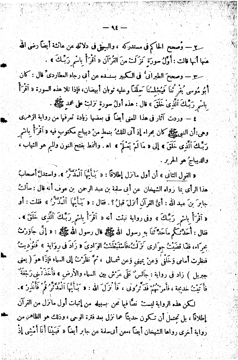 القول الثاني أن أول ما نزل إطلاقا: {يَا أَيُّهَا الْمُدَّثِّرُ} . واستدل أصحاب هذا الرأي بما رواه الشيخان عن أبي سلمة بن عبد الرحمن بن عوف أنه قال: سألت جابر بن عبد الله أي القرآن أنزل قبل؟ فقال: {يَا أَيُّهَا الْمُدَّثِّرُ} فقلت: أو {اقْرَأْ بِاسْمِ رَبِّكَ} وفي رواية نبئت أنه {اقْرَأْ بِاسْمِ رَبِّكَ الَّذِي خَلَقَ} . فقال: أحدثكم ما حدثنا به رسول الله صلى الله عليه وسلم قال رسول الله صلى الله عليه وسلم: "إني جاورت بحراء فلما قضيت جواري نزلت فاستبطنت الوادي" زاد في رواية: "فنوديت فنظرت أمامي وخلفي وعن يميني وعن شمالي ثم نظرت إلى السماء فإذا هو" - يعني جبريل- زاد في رواية: "جالس على عرش بين السماء والأرض فأخذتني رجفة فأتيت خديجة فأمرتهم فدثروني، فأنزل الله: {يَا أَيُّهَا الْمُدَّثِّرُ قُمْ فَأَنْذِرْ} ".