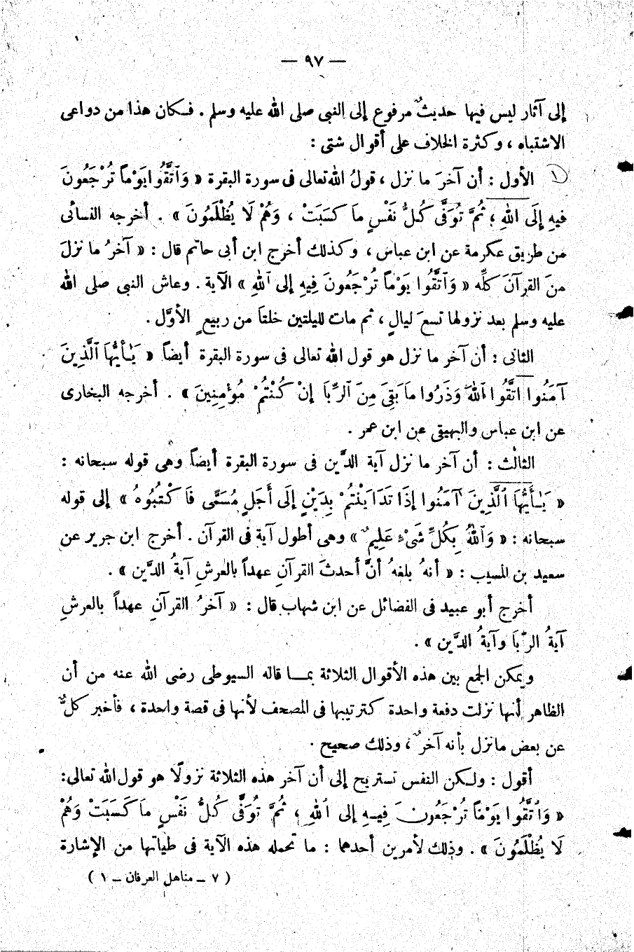الأول: أن آخر ما نزل قول الله تعالى في سورة البقرة: {وَاتَّقُوا يَوْماً تُرْجَعُونَ فِيهِ إِلَى اللَّهِ ثُمَّ تُوَفَّى كُلُّ نَفْسٍ مَا كَسَبَتْ وَهُمْ لا يُظْلَمُونَ} . أخرجه النسائي من طريق عكرمة عن ابن عباس وكذلك أخرج ابن أبي حاتم قال: آخر ما نزل من القرآن كله {وَاتَّقُوا يَوْماً تُرْجَعُونَ فِيهِ إِلَى اللَّهِ} الآية. وعاش النبي صلى الله عليه وسلم بعد نزولها تسع ليال ثم مات لليلتين خلتا من ربيع الأول.