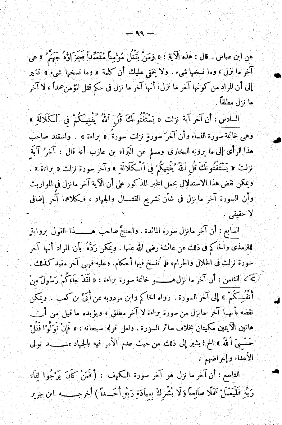 التاسع: أن آخر ما نزل هو آخر سورة الكهف: {فَمَنْ كَانَ يَرْجُوا لِقَاءَ رَبِّهِ فَلْيَعْمَلْ عَمَلاً صَالِحاً وَلا يُشْرِكْ بِعِبَادَةِ رَبِّهِ أَحَداً} أخرجه ابن جرير