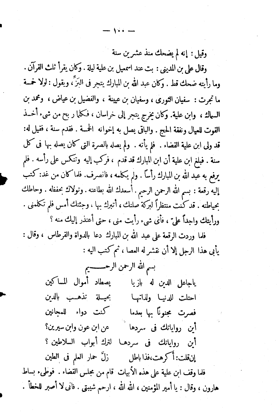وقال عَلِيّ بْن المديني: بت عند إسماعيل بن عليه ليلة وكان يقرآ ثلث القرآن وما رأيته ضحك قط وكان عبد اللَّه بْن المبارك يتجر فِي البز ويقول لولا خمسة ما تجرت سفيان الثوري وسفيان بْن عيينة والفضيل بْن عياض ومحمد بْن السماك وابن عليه وكان يخرج يتجر إلى خراسان فكلما ربح من شيء أخذ القوت للعيال ونفقة الحج والباقي يصل به إخوانه الخمسة فقدم سنة فقيل له قد ولي ابن علية القضاء فلم يأته ولم يصله بالصرة التي كان يصله بها فِي كل سنة فبلغ ابن علية أن ابن المبارك قد قدم فركب إليه وتنكس عَلَى رأسه فلم يرفع به عبد اللَّه بْن المبارك رأسا ولم يكلمه فانصرف فلما كان من غد كتب إليه رقعة بسم اللَّه الرحمن الرحيم أسعدك اللَّه بطاعته وتولاك بحفظه وحاطك بحياطته قد كنت منتظرًا لبركة صلتك أتبرك بها وجئتك أمس فلم تكلمني ورأيتك واجدًا عَلِيّ فأي شيء رأيت مني حتى أعتذر إليك منه.