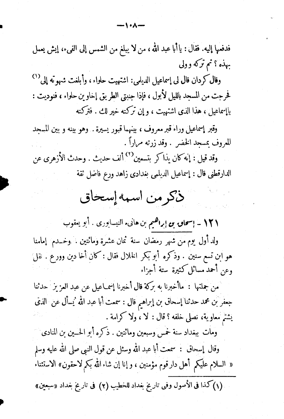 من جملتها ما أَخْبَرَنَا به بركة قال: أخبرنا إسماعيل عن عبد العزيز حَدَّثَنَا جعفر بن محمد حَدَّثَنَا إِسْحَاق بْن إِبْرَاهِيمَ قَالَ: سمعت أبا عبد اللَّه يسأل عَنِ الذي يشتم معاوية نصلي خلفه قَالَ: لا ولا كرامة.