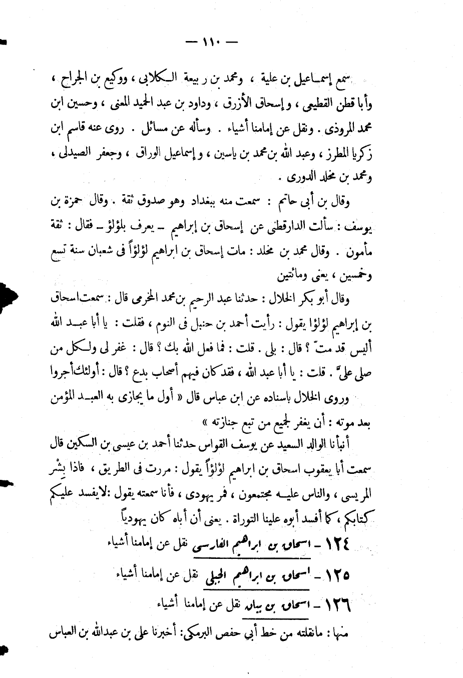 أَنْبَأَنَا الوالد السعيد عَنْ يوسف القواس حَدَّثَنَا أَحْمَد بْن عِيسَى بْن السكين قَالَ: سمعت أبا يَعْقُوب إِسْحَاق بْن إِبْرَاهِيمَ لؤلؤًا يقول مررت فِي الطريق فإذا بشر المريسي والناس عليه مجتمعون فمر يهودي فأنا سمعته يقول لا يفسد عليكم كتابكم كما أفسد أبوه علينا التوراة يعني أن أباه كان يهوديًا.