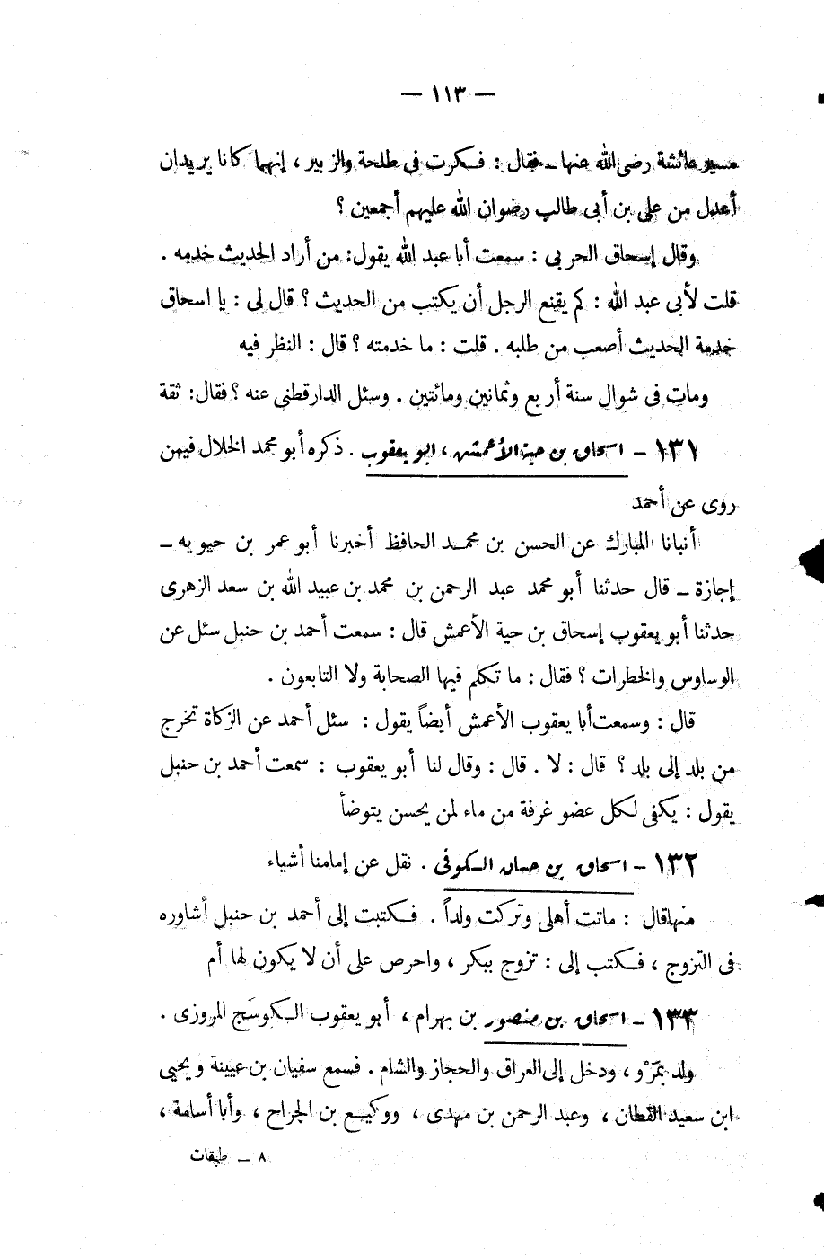 قال وسمعت أبا يَعْقُوب الأعمش أَيْضًا يقول سئل أَحْمَد عَنِ الزكاة تخرج من بلد إلى بلد قَالَ: لا قَالَ: وقال لنا أبو يَعْقُوب سمعت أَحْمَد بن حنبل يقول يكفي لكل عضو غرفة من ماء لمن يحسن يتوضأ.