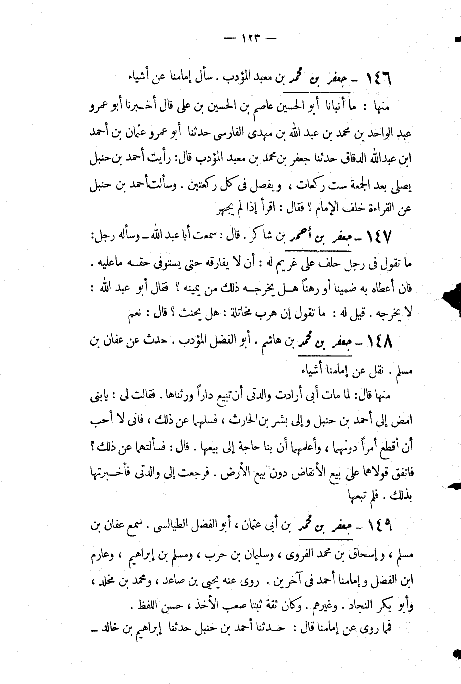 منها ما أَنْبَأَنَا أبو الحسين عاصم بن الحسين بْن عَلِيٍّ قَالَ: أَخْبَرَنَا أبو عَمْرو عبد الواحد بن محمد بْن عَبْدِ اللَّهِ بْن مهدي الفارسي حَدَّثَنَا أبو عَمْرو عُثْمَان بْن أَحْمَدَ بْن عَبْدِ اللَّهِ الدقاق حَدَّثَنَا جَعْفَر بن محمد بْنِ معبد المؤدب قَالَ: رأيت أَحْمَد بن حنبل يصلي بعد الجمعة ست ركعات ويفصل فِي كل ركعتين وسألت أَحْمَد بن حنبل عَنِ القراءة خلف الإمام فقال: اقرأ إذا لم يجهر.
