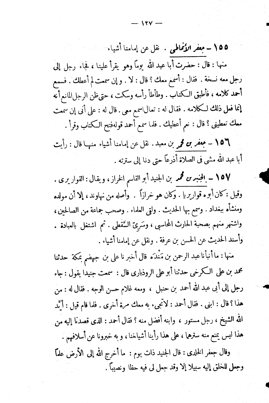 منها ما أَنْبَأَنَا عبد الرحمن بْن منده قَالَ: أَخْبَرَنَا عَلِيّ بْن جهضم بمكة حَدَّثَنَا مُحَمَّد بْن عَلِيٍّ الكرخي حَدَّثَنَا أبو عَلِيّ الروذباري قَالَ: سمعت جنيدًا يقول جاء رجل إلى أبي عبد اللَّه أحمد بن حنبل ومعه غلام حسن الوجه فقال: له من هذا قَالَ: ابني فقال: أَحْمَد لا تجيء به معك مرة أخرى فلما قام قيل أيد اللَّه الشيخ رجل مستور وابنه أفضل منه فقال: أَحْمَد الذي قصدنا إليه من هذا ليس يمنع منه سترهما عَلَى هذا رأينا أشياخنا وبه خبرونا عَنْ أسلافهم.