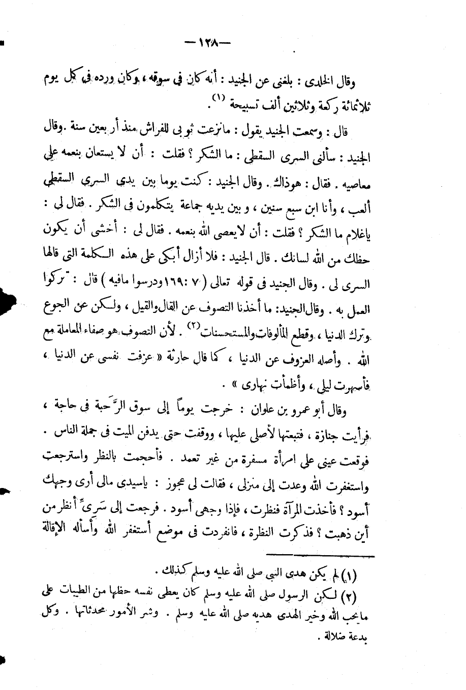 قَالَ وسمعت الجنيد يقول ما نزعت ثوبي للفراش منذ أربعين سنة وقال الجنيد سألني السري السقطي ما الشكر فقلت: أن لا يستعان بنعمه عَلَى معاصيه فقال: هو ذاك وقال الجنيد كنت يوما بين يدي السري السقطي ألعب وأنا ابن سبع سنين وبين يديه جماعة يتكلمون فِي الشكر فقال: لي يا غلام ما الشكر فقلت: أن لا يعصى اللَّه بنعمه فقال: لي أخشى أن يكون حظك من اللَّه لسانك قَالَ: الجنيد فلا أزال أبكي عَلَى هذه الكلمة التي قالها السري لي وقال الجنيد فِي قوله تعالى " وَدَرَسُوا ما فيه " قَالَ: تركوا العمل به وقال الجنيد ما أخذنا التصوف عَنِ القال والقيل ولكن عَنِ الجوع وترك الدنيا وقطع المألوفات والمستحسنات لأن التصوف هو صفاء المعاملة مع اللَّه وأصله العزوف عَنِ الدنيا كما قَالَ: حارثة عزفت نفسي عَنِ الدنيا فأسهرت ليلي وأظمأت نهاري.
