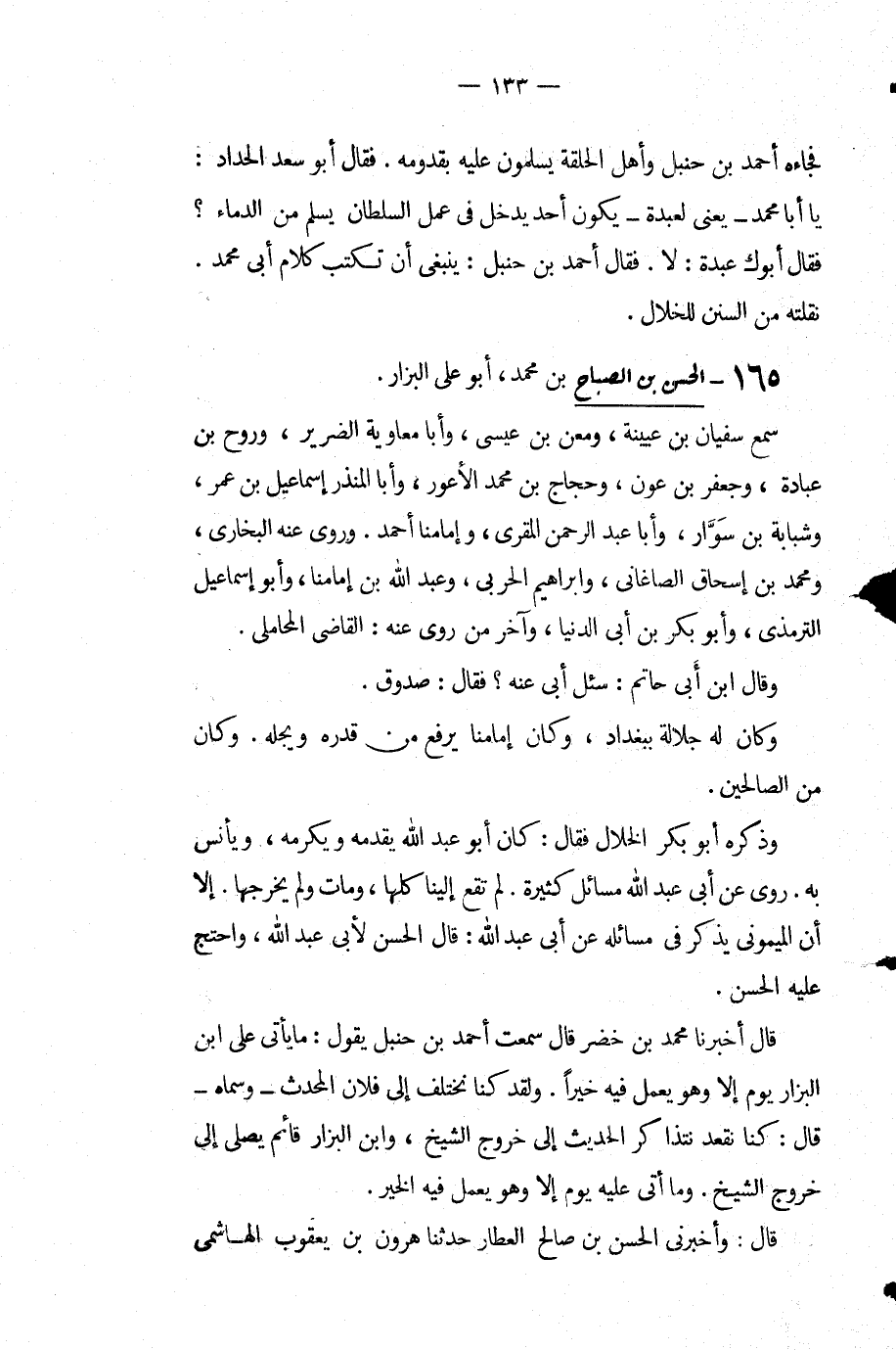 وذكره أبو بكر الخلال فقال: كان أَبُو عَبْدِ اللَّهِ يقدمه ويكرمه ويأنس به روى عَنْ أبي عبد اللَّه مسائل كثيرة لم تقع إلينا كلها ومات ولم يخرجها إلا أن الميموني يذكر فِي مسائله عَنْ أبي عبد اللَّه قَالَ: الحسن لأبي عبد اللَّه واحتج عليه الحسن.