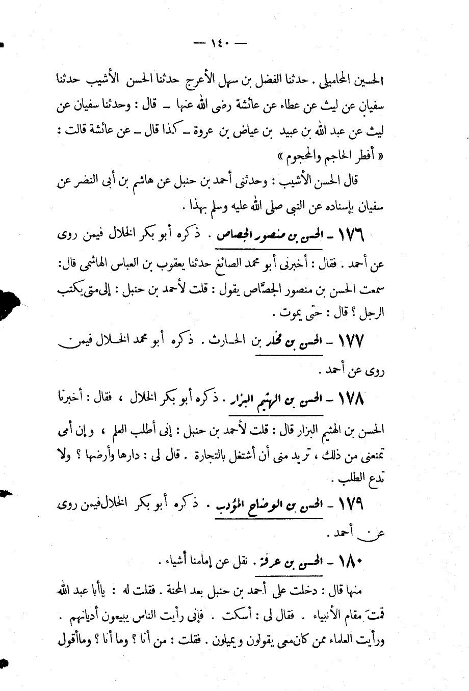 ذكره أَبُو بَكْرٍ الخلال فقال: أَخْبَرَنَا الحسن بْن الهيثم البزار قَالَ: قلت: لأحمد بْن حنبل إني أطلب العلم وإن أمي تمنعني من ذلك تريد مني أن أشتغل بالتجارة قَالَ: لي دارها وأرضها؟ ولا تدع الطلب.