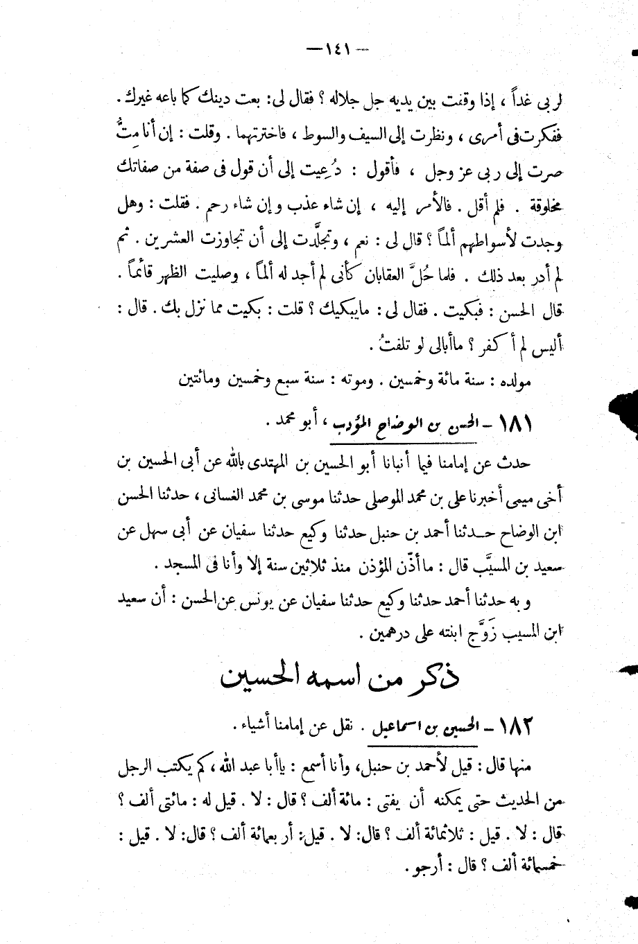 لربي غدًا إذا وقفت بين يديه جل جلاله فقال: لي بعت دينك كما باعه غيرك ففكرت فِي أمري ونظرت إلى السيف والسوط فاخترتهما وقلت: إن أنا مت صرت إلى ربي عَزَّ وَجَلَّ فأقول دعيت إلى أن قول فِي صفة من صفاتك مخلوقة فلم أقل فالأمر إليه إن شاء عذب وإن شاء رحم فقلت: وهل وجدت لأسواطهم ألما قَالَ: لي نعم وتجلدت إلى أن تجاوزت العشرين ثم لم أدر بعد ذلك فلما حل العقابان كأني لم أجد له ألما وصليت الظهر قائما قَالَ: الحسن فبكيت فقال: لي ما يبكيك قلت: بكيت مما نزل بك قَالَ: أليس لم أكفر ما أبالي لو تلفت.