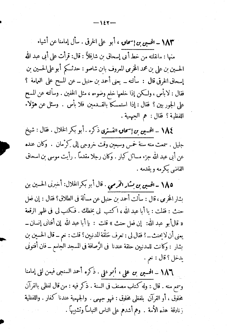منها ما نقلته من خط أبي إِسْحَاق بْن شاقلا قَالَ: قرأت عَلَى أبي عَبْد اللَّهِ الحسين بْن عَلِيِّ بْنِ مُحَمَّدٍ المخرمي المعروف بابن شاصو حدثكم أَبُو عَلِيّ الحسين بْن إِسْحَاقَ الخرقي قَالَ: سألته يعني أَحْمَد بن حنبل عَنِ المسح عَلَى العمامة فقال: لا باس ولكن إذا خلعها خلع وضوءه مثل الخفين وسألته عَنِ المسح عَلَى الجوربين فقال: إذا استمسكا بالقدمين فلا بأس وسئل عَنْ هؤلاء اللفظية فقال: هم الجهمية.