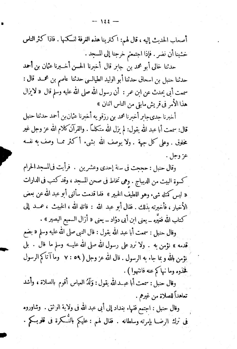 حَدَّثَنَا خَالِي أَبُو مُحَمَّدِ بْنُ جَابِرٍ قَالَ: أَخْبَرَنَا الْحَسَنُ أَخْبَرَنَا عُثْمَانُ بْنُ أَحْمَدَ حَدَّثَنَا حَنْبَلُ بْنُ إِسْحَاقَ حَدَّثَنَا أَبُو الْوَلِيدِ الطَّيَالِسِيُّ حَدَّثَنَا عَاصِمُ بْنُ مُحَمَّدٍ قَالَ: سَمِعْتُ أَبِي يُحَدِّثُ عَنِ ابْنِ عُمَرَ أَن رَسُول اللَّهِ - صَلَّى اللَّهُ عَلَيْهِ وَسَلَّمَ - قَالَ: " لا يَزَالُ هَذَا الأَمْرُ فِي قُرَيْشٍ مَا بَقِيَ مِنَ النَّاسِ اثْنَانِ " أَخْبَرَنَا جَدِّي جابر أخبرنا محمد بْنُ رَزْقَوَيْهِ أَخْبَرَنَا عُثْمَانُ بْنُ أَحْمَدَ حَدَّثَنَا حَنْبَلٌ قَالَ: سَمِعْتُ أَبَا عَبْدِ اللَّهِ يَقُولُ لَمْ يَزَلِ اللَّهُ مُتَكَلِّمًا وَالْقُرْآنُ كَلامُ اللَّهِ عَزَّ وَجَلَّ غَيْرُ مَخْلُوقٍ وَعَلَى كُلِّ جِهَةٍ وَلا يُوصَفُ اللَّهُ بِشَيْءٍ أَكْثَرَ مِمَّا وَصَفَ بِهِ نَفْسَهُ عَزَّ وَجَلَّ.