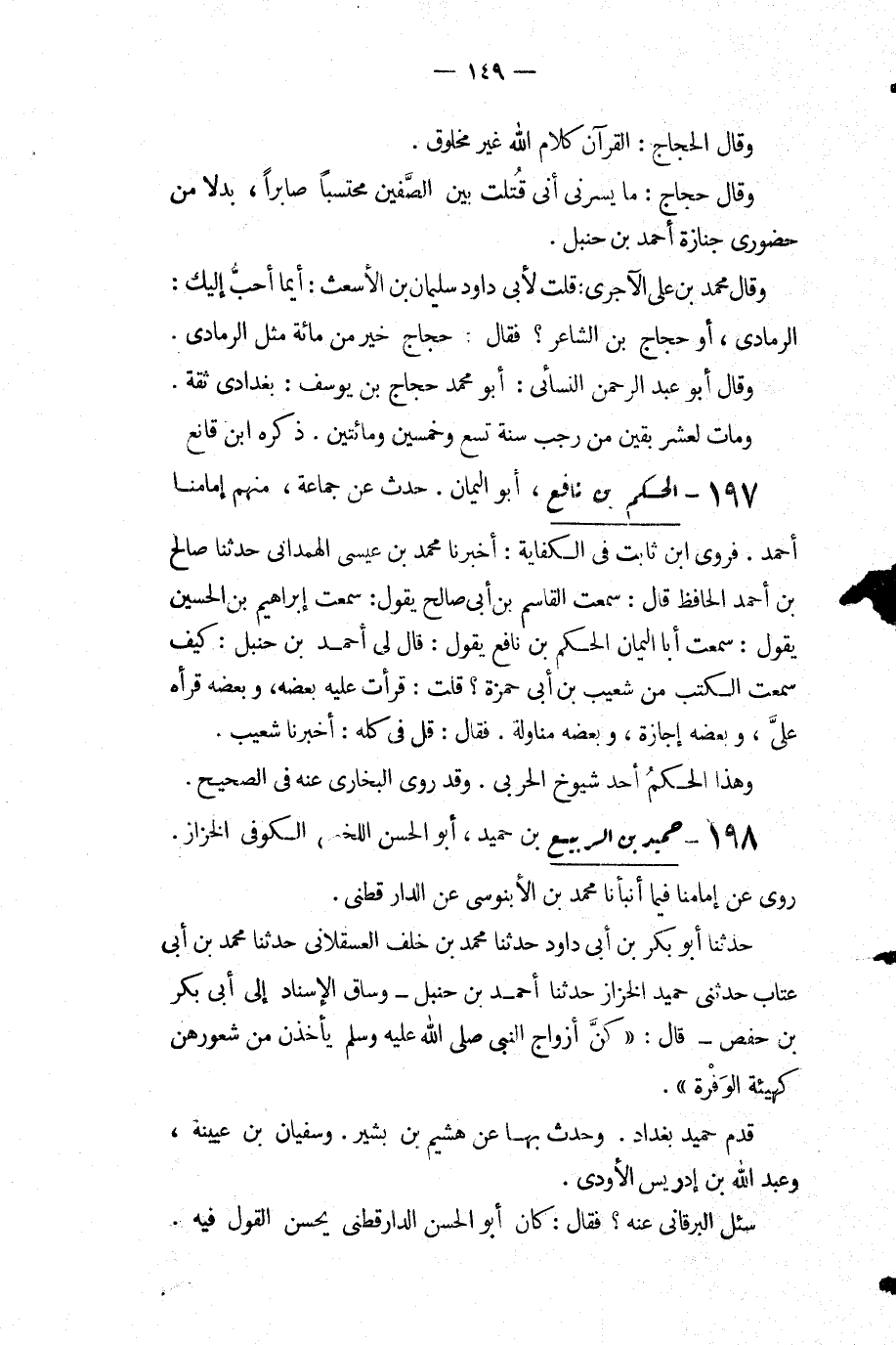 حَدَّثَنَا أبو بكر بْن أبي دَاوُد حَدَّثَنَا مُحَمَّد بْن خلف العسقلاني حَدَّثَنَا مُحَمَّد بْن أبي عتاب حَدَّثَنِي حميد الخزاز حَدَّثَنَا أَحْمَد بن حنبل وساق الإسناد إلى أبى بكر بن حفص قال: " كن أزواج النَّبِيّ - صَلَّى اللَّهُ عَلَيْهِ وَسَلَّمَ - يأخذن من شعورهن كهيئة الوفرة ".
