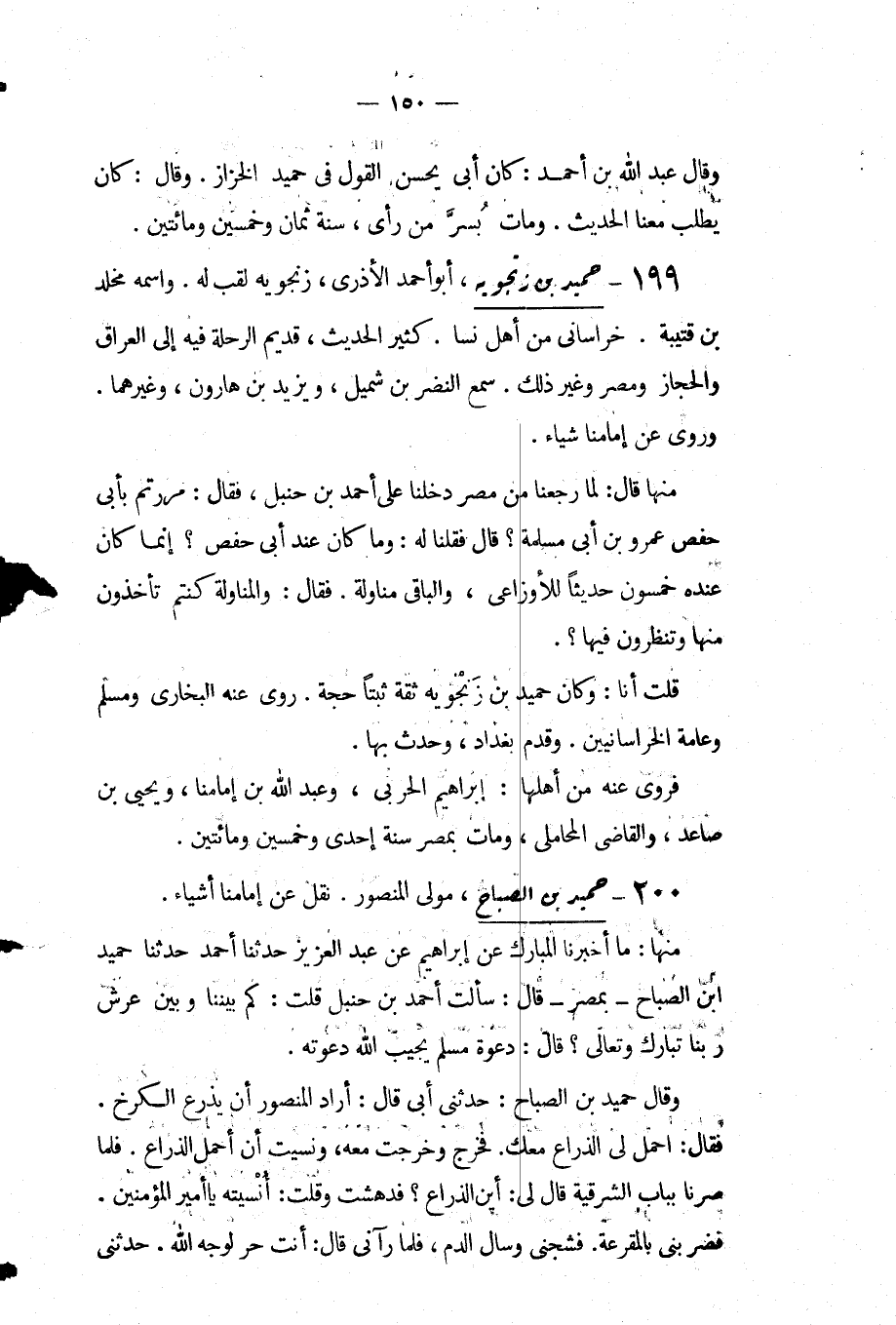 منها قَالَ: لما رجعنا من مصر دخلنا عَلَى أَحْمَد بن حنبل فقال: مررتم بأبي حفص عَمْرو بْن أبي مسلمة قَالَ: فقلنا له وما كان عند أبي حفص إنما كان عنده خمسون حديثًا للأوزاعي والباقي مناولة فقال: والمناولة كنتم تأخذون منها وتنظرون فيها؟ قلت: أنا وكان حميد بْن زنجويه ثقة ثبتا حجة روى عنه البخاري ومسلم وعامة الخراسانيين وقدم بغداد وحدث بها.