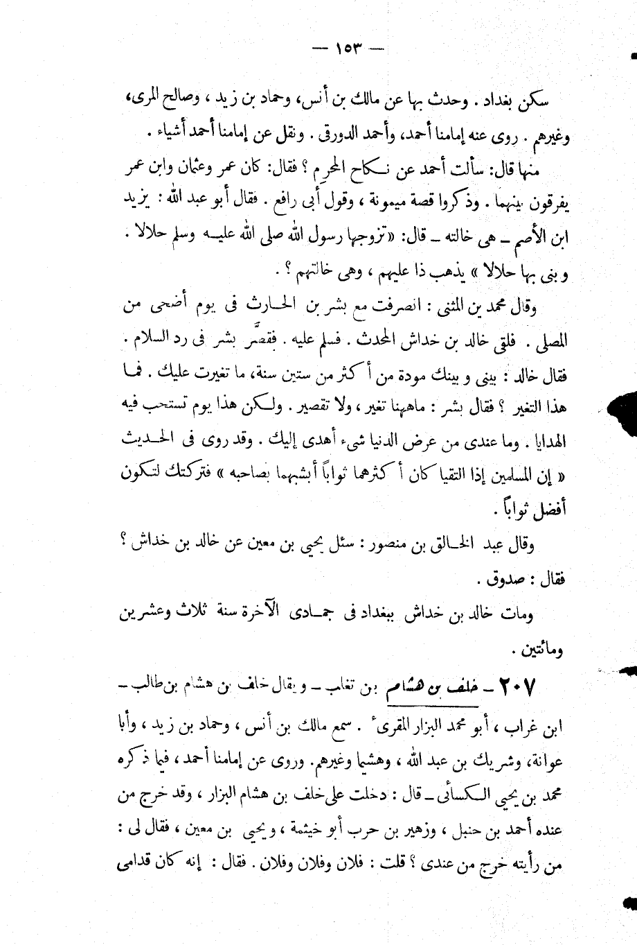 خلف بن هشام بن تغلب ويقال خلف بْن هشام بْن طالب ابن غراب أبو محمد البزار المقرىء سمع مالك بْن أنس وحماد بْن زَيْدٍ وأبا عوانة وشريك بْن عَبْدِ اللَّهِ وهشيما وغيرهم وروى عَنْ إمامنا أَحْمَد فيما ذكره مُحَمَّد بْن يَحْيَى الكسائي قَالَ: دخلت عَلَى خلف بْن هشام البزار وقد خرج من عنده أَحْمَد بن حنبل وزهير بْن حرب أَبُو خيثمة وَيَحْيَى بْن معين فقال: لي من رأيته خرج من عندي قلت: فلان وفلان وفلان فقال: إنه كان قدامي