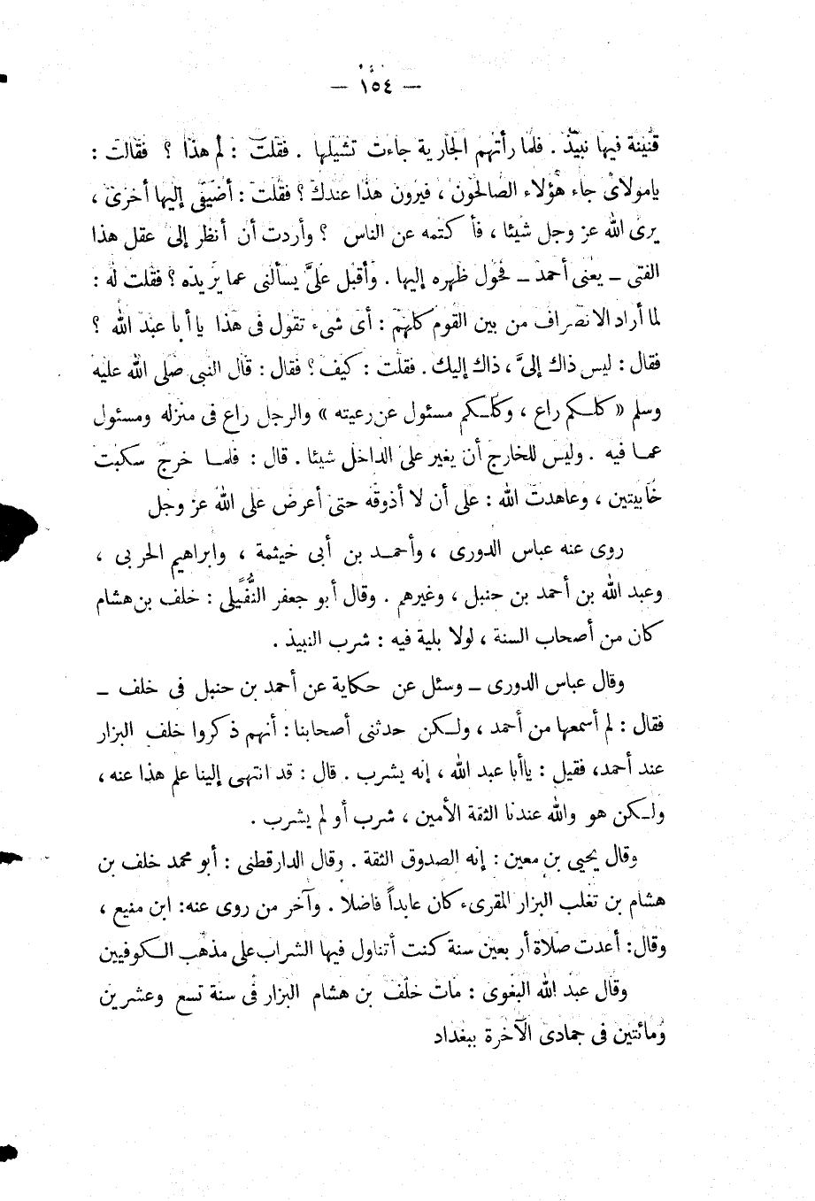 قنينة فيها نبيذ فلما رأتهم الجارية جاءت تشيلها فقلت: لم هذا فقالت يا مولاي جاء هؤلاء الصالحون فيرون هذا عندك فقلت: أضيف إليها أخرى يرى الله عز وجل شيئا فاكتمه عَنِ الناس وأردت أن أنظر إلى عقل هذا الفتى يعني أَحْمَد فحول ظهره إليها وأقبل علي يسألني عما يرده فقلت: له لما أراد الانصراف من بين القوم كلهم أي شيء تقول فِي هذا يا أبا عَبْد اللَّهِ فقال: ليس ذاك إلي ذاك إليك فقلت: كيف فقال: قَالَ: النَّبِيُّ - صَلَّى اللَّهُ عَلَيْهِ وَسَلَّمَ - كلكم راع وكلكم مسئول عَنْ رعيته والرجل راع فِي منزله ومسئول عما فيه وليس للخارج أن يغير عَلَى الداخل شيئا قَالَ: فلما خرج سكبت خابيتين وعاهدت اللَّه عَلَى أن لا أذوقه حتى أعرض عَلَى اللَّه عَزَّ وَجَلَّ.