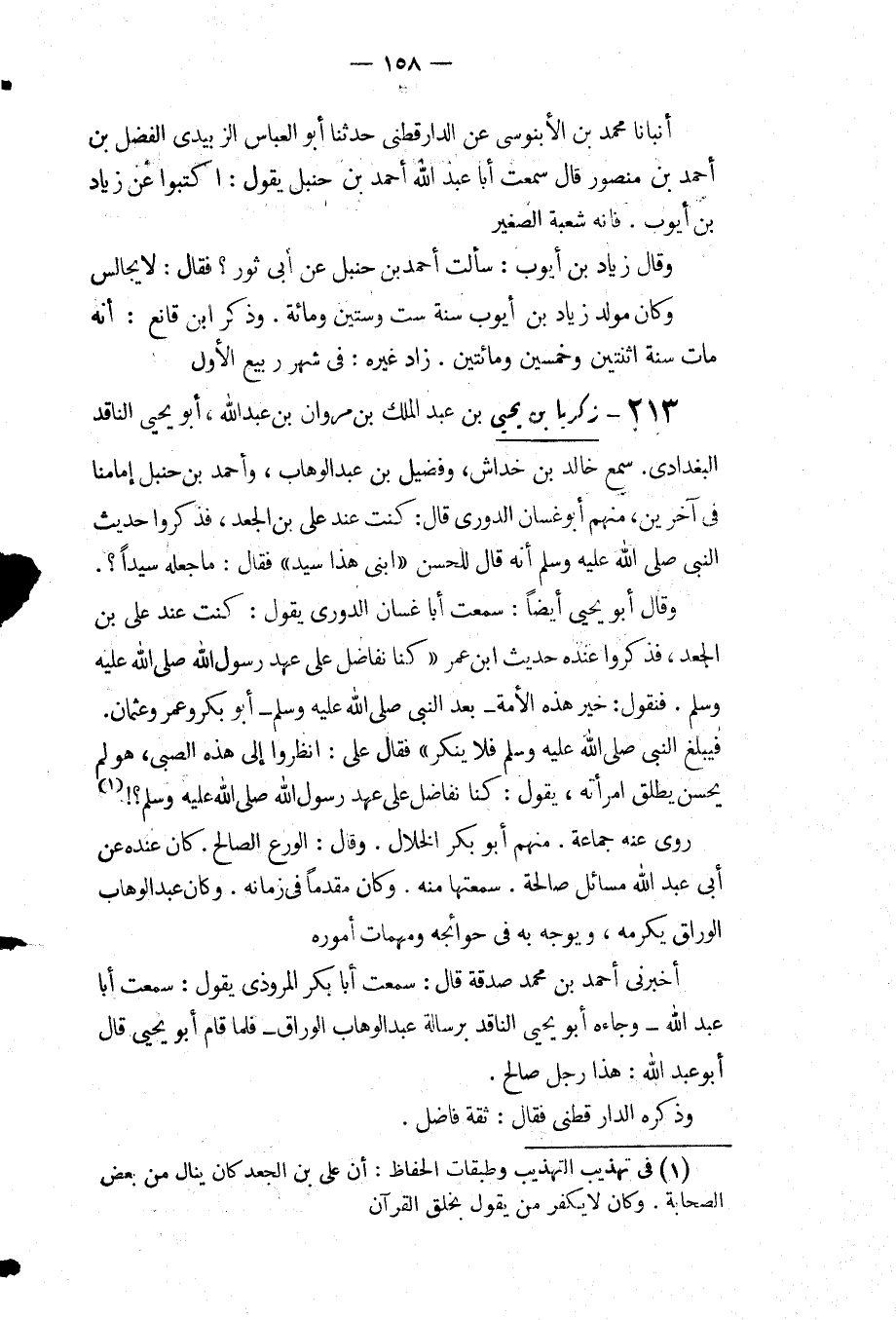 زكريا بْن يَحْيَى بْن عبد الملك بْن مروان بْن عَبْدِ اللَّهِ أَبُو يَحْيَى الناقد البغدادي سمع خالد بْن خداش وفضيل بن عبد الوهاب وأحمد بْن حنبل إمامنا فِي آخرين منهم أَبُو غسان الدوري قَالَ: كنت عند عَلِيّ بْن الجعد فذكروا حديث النَّبِيّ - صَلَّى اللَّهُ عَلَيْهِ وَسَلَّمَ - أنه قَالَ: للحسن ابني هذا سيد فقال: ما جعله سيدًا.