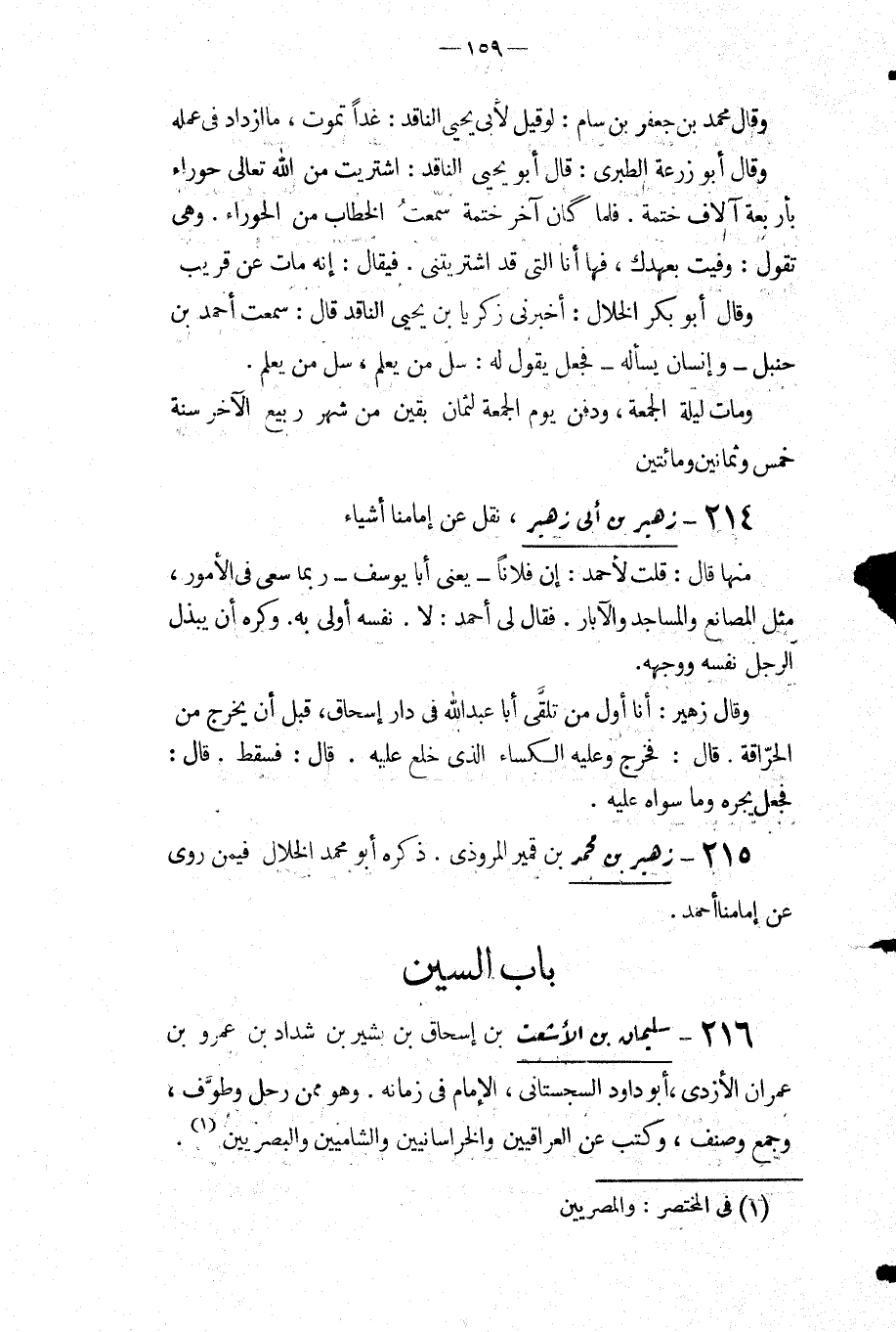 وقال أبو بكر الخلال أَخْبَرَنِي زكريا بْن يَحْيَى الناقد قَالَ: سمعت أحمد بن حنبل وإنسان يسأله فجعل يقول له سل من يعلم سلم من يعلم.