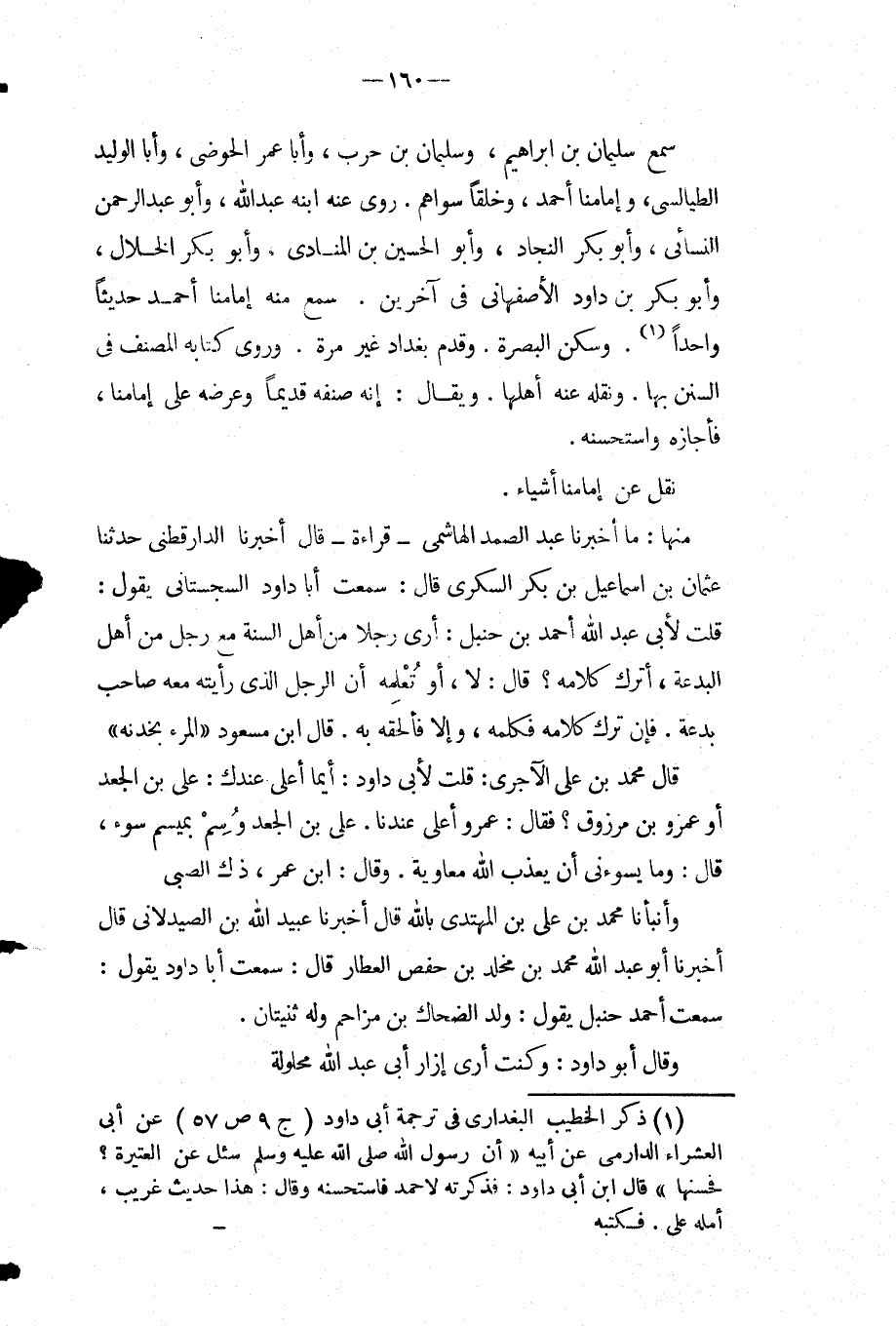 منها ما أَخْبَرَنَا عَبْدُ الصَّمَدِ الْهَاشِمِيُّ قِرَاءَةً قَالَ: أَخْبَرَنَا الدَّارَقُطْنِيُّ حَدَّثَنَا عُثْمَانُ بْنُ إِسْمَاعِيل بْن بكر السكري قَالَ: سَمِعْتُ أَبَا دَاوُدَ السِّجِسْتَانِيَّ يَقُولُ قلت: لأبي عبد اللَّه أَحْمَد بْنِ حَنْبَلٍ أَرَى رَجُلا مِنْ أَهْلِ السُّنَّةِ مَعَ رَجُلٍ مِنْ أَهْلِ الْبِدْعَةِ أَتْرُكُ كَلامَهُ قَالَ: لا أو تعلمه أَنَّ الرَّجُلَ الَّذِي رَأَيْتَهُ مَعَهُ صَاحِبُ بِدْعَةٍ فَإِنْ تَرَكَ كَلامَهُ فَكَلِّمْهُ وَإِلا فَأَلْحِقْهُ بِهِ قَالَ: ابْنُ مَسْعُودٍ الْمَرْءُ بِخِدْنِهِ قَالَ مُحَمَّد بْن عَلِيٍّ الآجري قلت: لأبي دَاوُد أيما أعلى عندك عَلِيّ بْن الجعد أو عَمْرو بْن مرزوق فقال: عَمْرو أعلى عندنا عَلِيّ بْن الجعد وسم بميسم سوء قَالَ: وما يسوءني أن يعذب اللَّه معاوية وقال ابْن عُمَرَ ذاك الصبي.