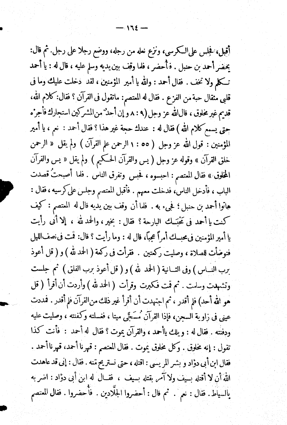 أقبل فجلس عَلَى الكرسي ونزع نعله من رجله ووضع رجلا عَلَى رجل ثم قَالَ: يحضر أَحْمَد بن حنبل فأحضر فلما وقف بين يديه وسلم عليه قال: له يا أَحْمَد تكلم ولا تخف فقال: أَحْمَد والله يا أمير المؤمنين لقد دخلت عليك وما فِي قلبي مثقال حبة من الفزع فقال: له المعتصم ما تقول فِي القرآن فقال: كلام اللَّه قديم غير مخلوق قَالَ: اللَّهُ عَزَّ وَجَلَّ " وَإِنْ أَحَدٌ مِنَ الْمُشْرِكِينَ اسْتَجَارَكَ فَأَجِرْهُ حتى يسمع كلام الله " فقال: له عندك حجة غير هذا فقال: أَحْمَد نعم يا أمير المؤمنين قول اللَّه عَزَّ وجل " الرحمن علم القرآن " ولم يقل الرحمن خلق القرآن وقوله عَزَّ وجل " يس والقرآن الحكيم " ولم يقل يس والقرآن المخلوق فقال: المعتصم احبسوه فحبس وتفرق الناس فلما أصبحت قصدت الباب فأدخل الناس فدخلت معهم فأقبل المعتصم وجلس عَلَى كرسيه فقال: هاتوا أَحْمَد بن حنبل فجيء به فلما أن وقف بين يديه قَالَ: له المعتصم كيف كنت يا أَحْمَد فِي محبسك البارحة فقال: بخير والحمد لله إلا أني رأيت يا أمير المؤمنين فِي محبسك أمرًا عجبا قال: له وما رأيت قَالَ: قمت فِي نصف الليل فتوضأت للصلاة وصليت ركعتين فقرأت فِي ركعة " الْحَمْدُ لِلَّهِ " و " قُلْ أَعُوذُ بِرَبِّ النَّاسِ " وفي الثانية " الحمد لله " و " قُلْ أَعُوذُ بِرَبِّ الْفَلَقِ " ثم جلست وتشهدت وسلمت ثم قمت فكبر قرأت " الحمد لله " وأردت أن أقرأ " قُلْ هُوَ الله أحد " فلم أقدر ثم اجتهدت أن أقرأ غير ذلك من القرآن فلم أقدر فمددت عيني فِي زاوية السجن فإذا القرآن مسجى ميتا فغسلته وكفنته وصليت عليه ودفنته فقال: له ويلك يا أَحْمَد والقرآن يموت فقال: له أَحْمَد فأنت كذا تقول إنه مخلوق وكل مخلوق يموت فقال: المعتصم قهرنا أَحْمَد فهرنا أحمد فقال: ابن أبي داود وبشر المريسي اقتله حتى نستريح منه فقال: إني قد عاهدت اللَّه أن لا أقتله بسيف ولا آمر بقتله بسيف فقال: له ابن أبي دؤاد اضربه بالسياط فقال: نعم ثم قَالَ: أحضروا الجلادين فأحضروا فقال: المعتصم