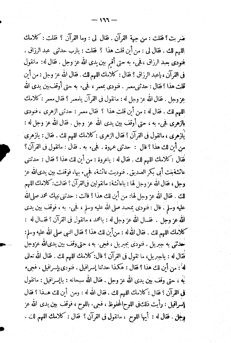 ضربت فقلت: من جهة القرآن فقال: لي وما القرآن فقلت: كلامك اللهم لك فقال: لي من أين قلت: هذا فقلت: يا رب حَدَّثَنِي عبد الرزاق فنودي بعبد الرزاق فجيء به حتى أقيم بين يدي اللَّه عَزَّ وَجَلَّ فقال: له ما تقول فِي القرآن يا عبد الرزاق فقال: كلامك اللهم لك فقَالَ: اللَّهُ عَزَّ وَجَلَّ من أين قلت: هذا فقال: حَدَّثَنِي معمر فنودي بمعمر فجيء به حتى أوقف بين يدي اللَّه عَزَّ وَجَلَّ فقَالَ: اللَّهُ عَزَّ وَجَلَّ له ما تقول فِي القرآن يا معمر فقال: معمر كلامك اللهم لك فقال: له من أين قلت: هذا فقال: معمر حَدَّثَنِي الزهري فنودي بالزهري فجيء به حتى أوقف بين يدي اللَّه عَزَّ وَجَلَّ فقال: اللَّهُ عَزَّ وَجَلَّ له يا زهري ما تقول فِي القرآن فقال: الزهري كلامك اللهم لك فقال: يا زهري من أين لك هذا قَالَ: حَدَّثَنِي عروة فجيء عروة فقال: ما تقول فِي القرآن فقال: كلامك اللهم لك فقال: له يا عروة من أين لك هذا فقال: حَدَّثَتْنِي عَائِشَة بنت أبي بكر الصديق فنوديت عَائِشَة فجيء بها فوقفت بين يدي اللَّه عَزَّ وَجَلَّ فقال: اللَّهُ عَزَّ وَجَلَّ لها يا عَائِشَة ما تقولين فِي القرآن فقالت كلامك اللهم لك فقال: اللَّه عَزَّ وَجَلَّ لها من أين لك هذا قَالَتْ حَدَّثَنِي نبيك مُحَمَّد - صَلَّى اللَّهُ عَلَيْهِ وَسَلَّمَ - قَالَ: فنودي بمحمد - صَلَّى اللَّهُ عَلَيْهِ وَسَلَّمَ - فجيء به فوقف بين يدي اللَّه عَزَّ وَجَلَّ فقَالَ: اللَّهُ عَزَّ وَجَلَّ يا مُحَمَّد ما تقول فِي القرآن فقال: له كلامك اللهم لك فقَالَ: اللَّهُ له من أين لك هذا فقَالَ: النَّبِيُّ - صَلَّى اللَّهُ عَلَيْهِ وَسَلَّمَ - حَدَّثَنِي به جبريل فنودي بجبريل فجيء به حتى وقف بين يدي اللَّه عَزَّ وَجَلَّ فقال: له يا جبريل ما تقول فِي القرآن قَالَ: كلامك اللهم لك فقَالَ: اللَّهُ تعالى له من أين لك هذا فقال: هكذا حَدَّثَنَا إسرافيل فنودي بإسرافيل فجيء به حتى وقف بين يدي اللَّه عَزَّ وَجَلَّ فقَالَ: اللَّهُ سبحانه يا إسرافيل ما تقول فِي القرآن فقال: كلامك اللهم لك فقال: الله له ومن أين لك هذا فقال: إسرافيل رأيت ذلك فِي اللوح المحفوظ فجيء باللوح فوقف بين يدي اللَّه عَزَّ وَجَلَّ فقال: له أيها اللوح ما تقول فِي القرآن فقال: كلامك اللهم لك