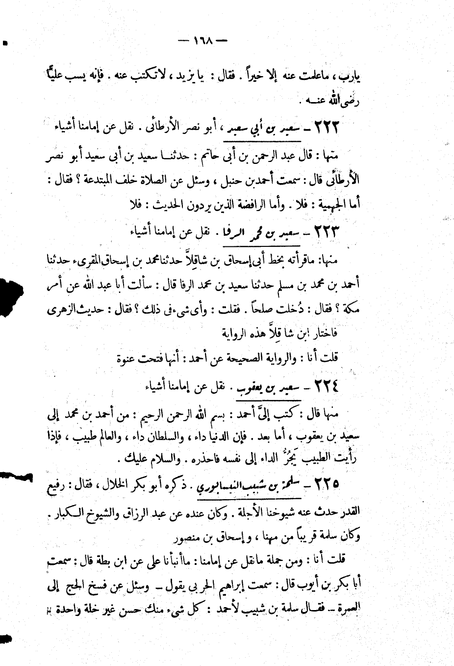 منها قَالَ: عبد الرحمن بْن أبي حاتم حَدَّثَنَا سعيد بْن أبي سعيد أَبُو نصر الأرطائي قَالَ: سمعت أحمد بن حنبل وسئل عَنِ الصلاة خلف المبتدعة فقال: أما الجهمية فلا وأما الرافضة الذين يردون الحديث فلا.