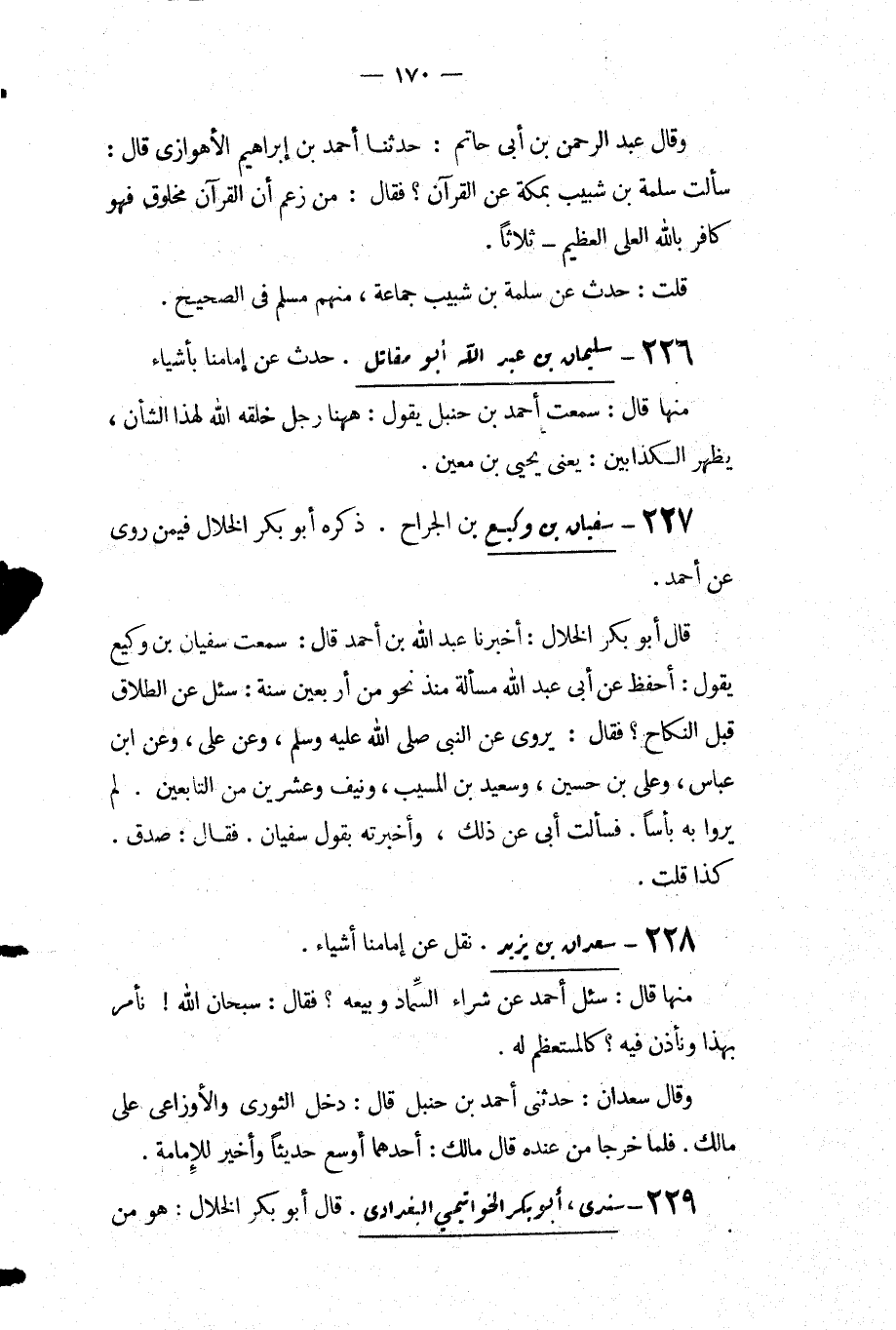 وقال عبد الرحمن بْن أبي حاتم حَدَّثَنَا أَحْمَد بْن إِبْرَاهِيمَ الأهوازي قَالَ: سألت سلمة بْن شبيب بمكة عَنِ القرآن فقال: من زعم أن القرآن مخلوق فهو كافر بالله العلي العظيم ثلاثًا.