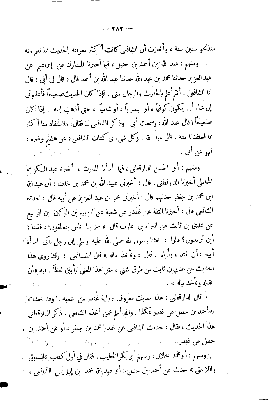 ومنهم أَبُو الحسن الدارقطني فيما أَنْبَأَنَا الُمَبارَكُ أَخْبَرَنَا عَبْدُ الْكَرِيمِ الْمَحَامِلِيُّ أَخْبَرَنَا الدَّارَقُطْنِيُّ قَالَ: أَخْبَرَنِي عبيد اللَّه بن محمد بْنِ خلف أن عبد الله ابن محمد بن جعفر حدثهم قَالَ: أَخْبَرَنِي عُمَرُ بْنُ عَبْدِ الْعَزِيزِ عَنْ أَبِيهِ قَالَ: حَدَّثَنَا الشَّافِعِيُّ قَالَ: أَخْبَرَنَا الثِّقَةُ عَنْ غُنْدَرٍ عَنْ شُعْبَةَ عَنِ الرَّبِيعِ بْنِ الرَّكِينِ بْنِ الرَّبِيعِ عَنْ عَدِيِّ بْنِ ثَابِتٍ عَنِ الْبَرَّاءِ بْنِ عَازِبٍ قَالَ: مَرَّ بِنَا نَاسٌ يَنْطَلِقُونَ فَقُلْنَا أَيْنَ تُرِيدُونَ قَالُوا بَعَثَنَا رَسُولُ اللَّهِ - صَلَّى اللَّهُ عَلَيْهِ وَسَلَّمَ - إِلَى رَجُلٍ يَأْتِي امْرَأَةَ أَبِيهِ أَنْ نَقْتُلَهُ وَأَرَاهُ قَالَ: وَنَأْخُذَ مَالَهُ قَالَ: الشَّافِعِيُّ وَقَدْ رُوِيَ هَذَا الْحَدِيثُ عَنْ عَدِيِّ بْنِ ثَابِتٍ مِنْ طُرُقٍ شَتَّى مِثْلَ هَذَا الْمَعْنَى وَأَبْيَنَ لَفْظًا فِيهِ أَنْ نَقْتُلَهُ وَنَأْخُذَ مَالَهُ.