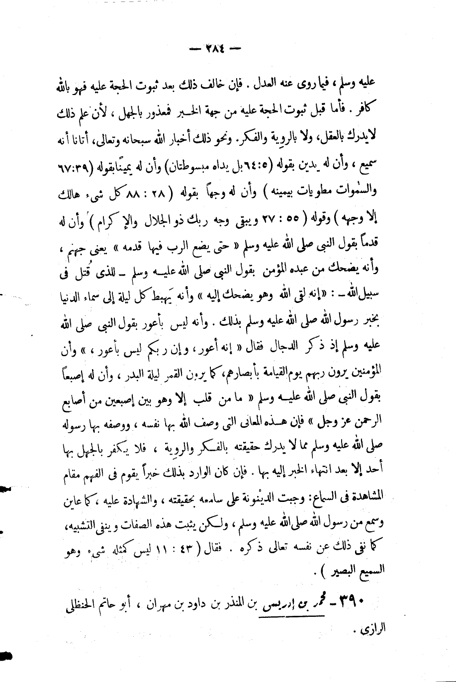 عَلَيْهِ وَسَلَّمَ فيما روى عنه العدل فإن خالف ذلك بعد ثبوت الحجة عليه فهو بالله كافر فأما قبل ثبوت الحجة عليه من جهة الخبر فمعذور بالجهل لأن علم ذلك لا يدرك بالعقل ولا بالروية والفكر ونحو ذلك أخبار اللَّه سبحانه وَتَعَالَى أتانا أنه سميع وأن له يدين بقوله " بَلْ يَدَاهُ مبسوطتان " وأن له يمينا بقوله " وَالسَّمَوَاتُ مطويات بيمينه " وأن له وجها بقوله " كُلُّ شيء هالك إلا وجهه " وقوله " وَيَبْقَى وَجْهُ رَبِّكَ ذُو الجلال والإكرام " وأن له قدما بقول النَّبِيّ - صَلَّى اللَّهُ عَلَيْهِ وَسَلَّمَ -: " حتى يضع الرب فيها قدمه " يعني جهنم وأنه يضحك من عبده المؤمن بقول النَّبِيّ - صَلَّى اللَّهُ عَلَيْهِ وَسَلَّمَ - للذي قتل فِي سبيل اللَّه " إنه لقي اللَّه وهو يضحك " إليه وأنه يهبط كل ليلة إلى سماء الدنيا بخبر رَسُول اللَّهِ - صَلَّى اللَّهُ عَلَيْهِ وَسَلَّمَ - بذلك وأنه ليس بأعور بقول النَّبِيّ - صَلَّى اللَّهُ عَلَيْهِ وَسَلَّمَ -: " إذ ذكر الدجال فقال: إنه أعور وإن ربكم ليس بأعور " وأن المؤمنين يرون ربهم يوم القيامة بأبصارهم كما يرون القمر ليلة البدر وأن له إصبعا بقول النَّبِيّ - صَلَّى اللَّهُ عَلَيْهِ وَسَلَّمَ -: " ما من قلب إلا وهو بين إصبعين من أصابع الرحمن عَزَّ وَجَلَّ " فإن هذه المعاني التي وصف اللَّه بها نفسه ووصفه بها رسوله - صَلَّى اللَّهُ عَلَيْهِ وَسَلَّمَ - مما لا يدرك حقيقته بالفكر والروية فلا يكفر بالجهل بها أحد إلا بعد انتهاء الخبر إليه بها فإن كان الوارد بذلك خبرًا يقوم فِي الفهم مقام المشاهدة فِي السماع وجبت الدينونة عَلَى سامعه بحقيقته والشهادة عليه كما عاين وسمع من رَسُول اللَّهِ - صَلَّى اللَّهُ عَلَيْهِ وسلم - ولكن يثبت هذه الصفات وينفي التشبيه كما نفي ذلك عَنْ نفسه تعالى ذكره فقال: " لَيْسَ كَمِثْلِهِ شَيْءٌ وَهُوَ السميع البصير ".